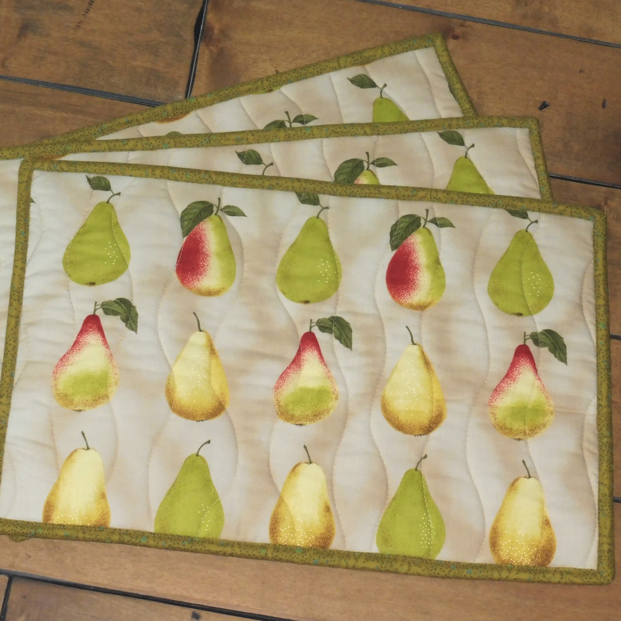These placemats were part of my long arm quilting learning curve back in 2012. I made them for myself and then never used them! The top fabric features large pears in gorgeous yellow, green and red. The backing fabric is a Kokka linen blend in deep olive green. Placemats measure approximately 17.5" wide x 11.5" deep. Sold individually.
