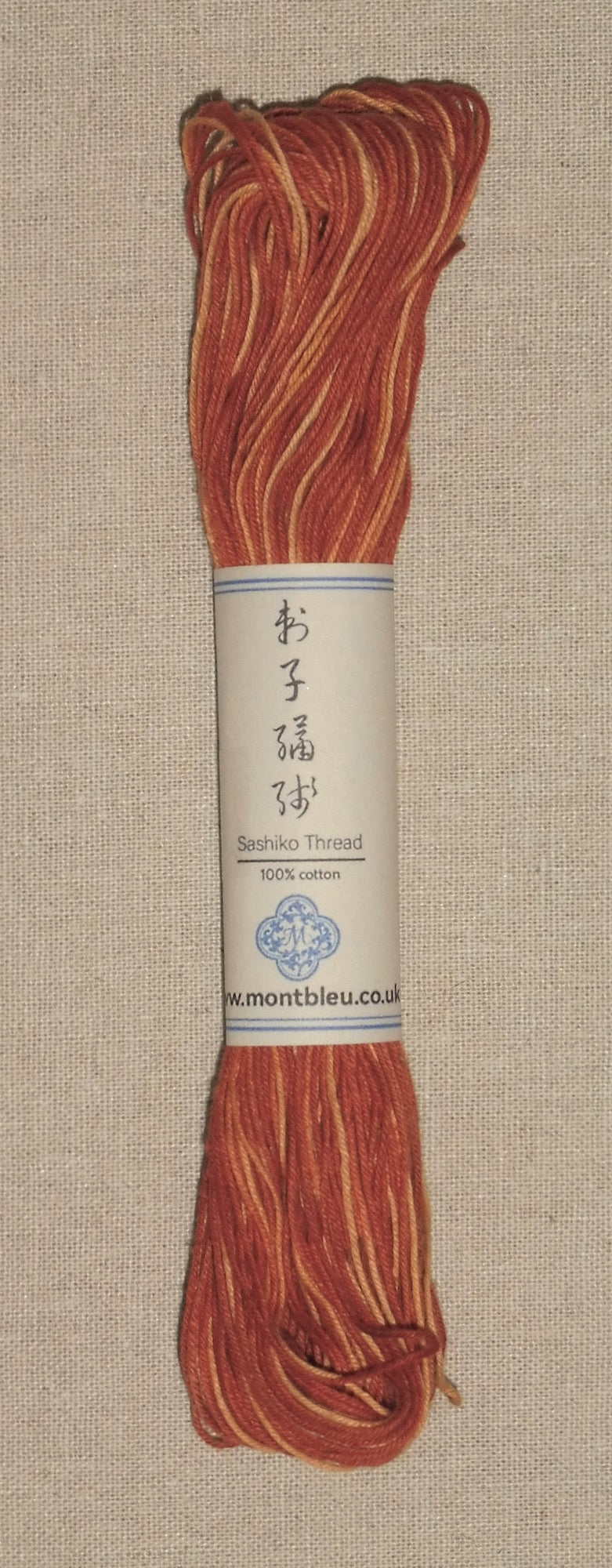 Imported from Mont Bleu of the UK, this is a 50 metre skein of medium weight, hand dyed cotton thread.  The medium weight from Mont Bleu is similar to the standard thick Sashiko threads manufactured commercially.   Please note that, due to the nature of hand dyeing, variations in skeins should be expected.