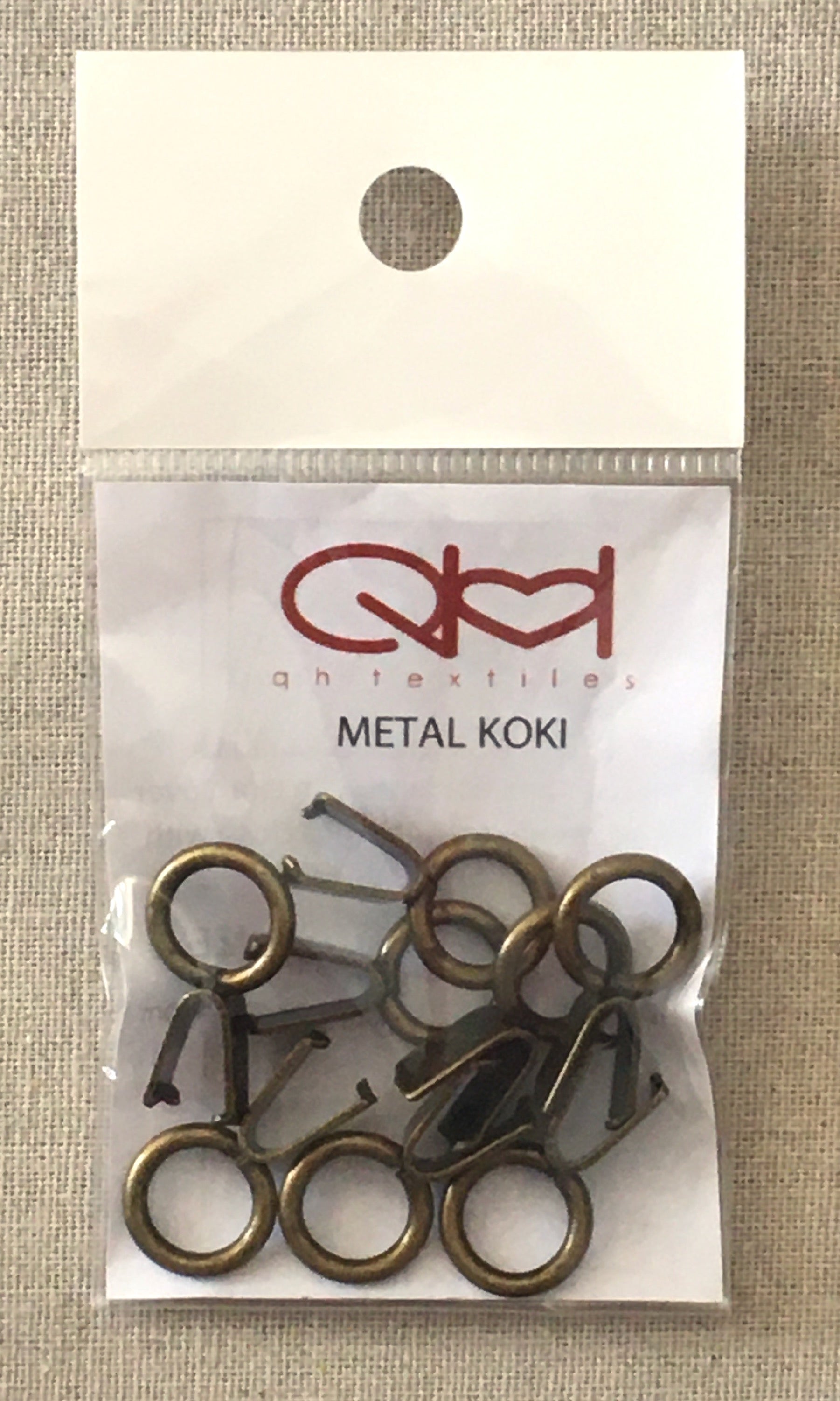 These clips can be used instead of tabs to close a drawstring bag, such as the Japanese rice bag. Each package contains 8 clips meant for one bag. The ring diameter measures 5/16" and the clip measures approximately 7/16" from hinge to tip. The secondary photo shows the bronze clips on a bag.