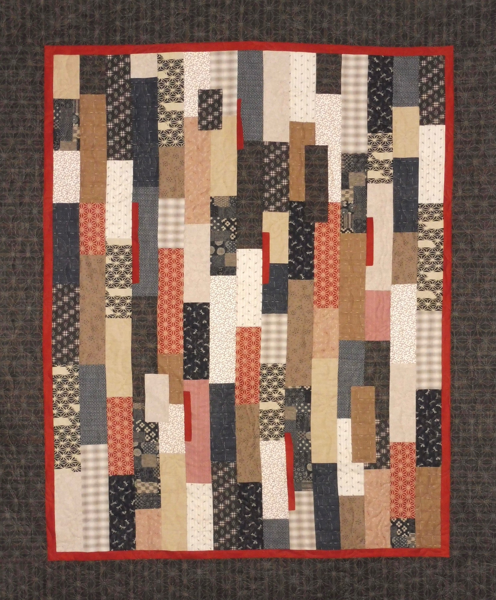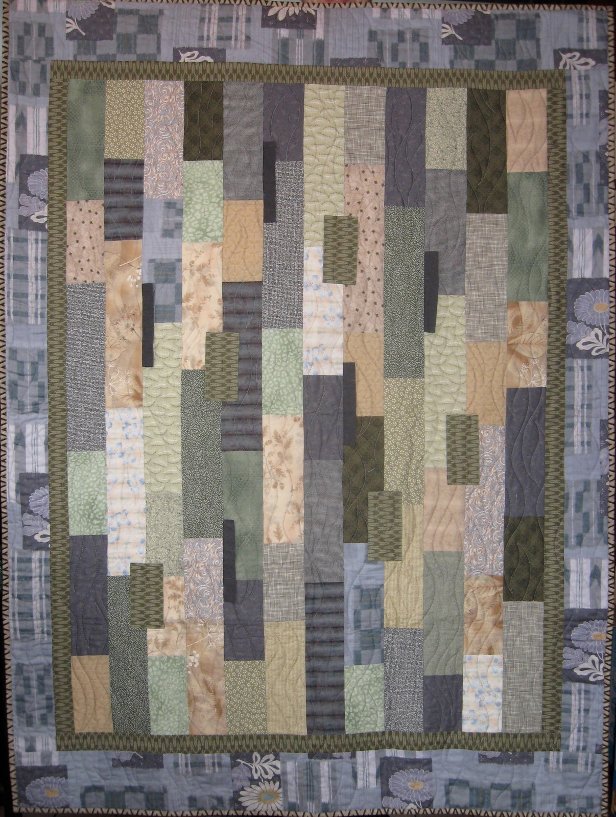 This pattern is an old favourite designed by Bella Nonna. It features staggered strips with applique and tab accents. You can use any fabrics of any colour, design and scale combination. The pattern makes a lap or small throw quilt measuring 49" x 58," but you can easily adjust the size.