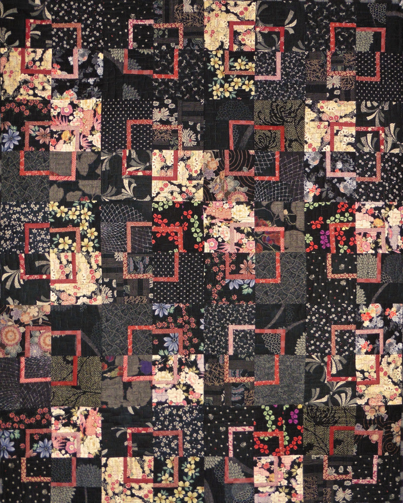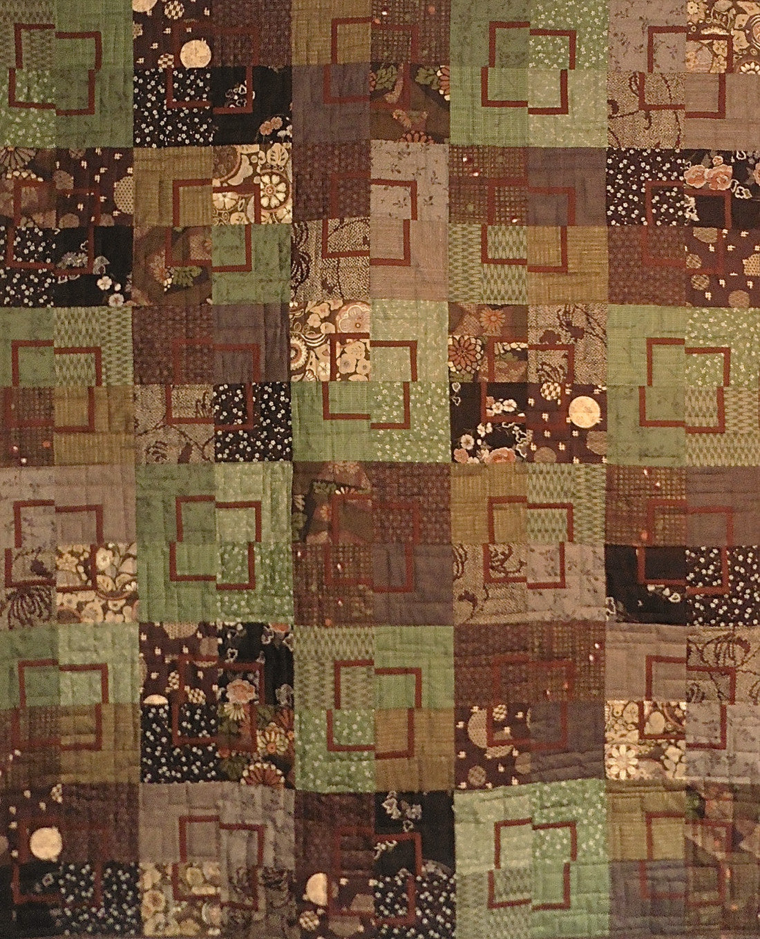 The additional photos show a version of Mod Quads made a few winters ago by Kallisti Quilts with the purpose of using up black Japanese floral prints and then a more recent quilt in green and brown textured Japanese prints.