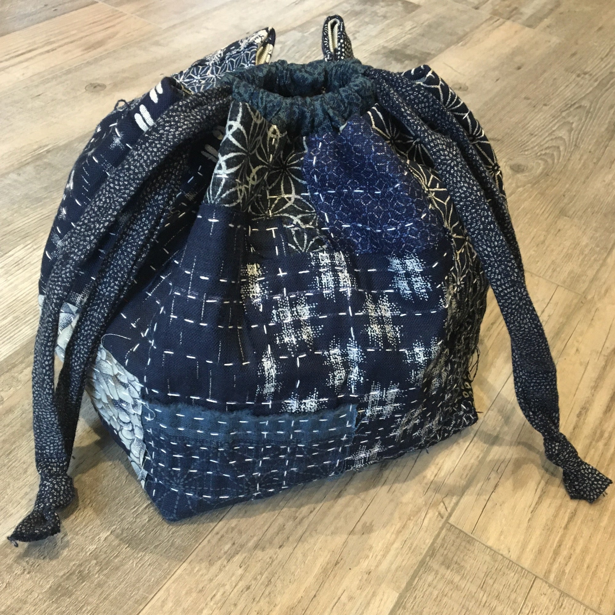 This pattern is designed by Karen Stevens. It features a modern take on a traditional komebukuro or drawstring Japanese rice rice bag that is traditionally used for carrying rice or gifts. Instructions make a bag measuring 6," 7" or 8." You can get creative with this pattern and make your panels with patchwork and/or add sashiko stitching. The additional photo shows Kallisti's first version made from scraps. Various kits will be available in spring 2024, but if you would like a custom kit now, please email me!