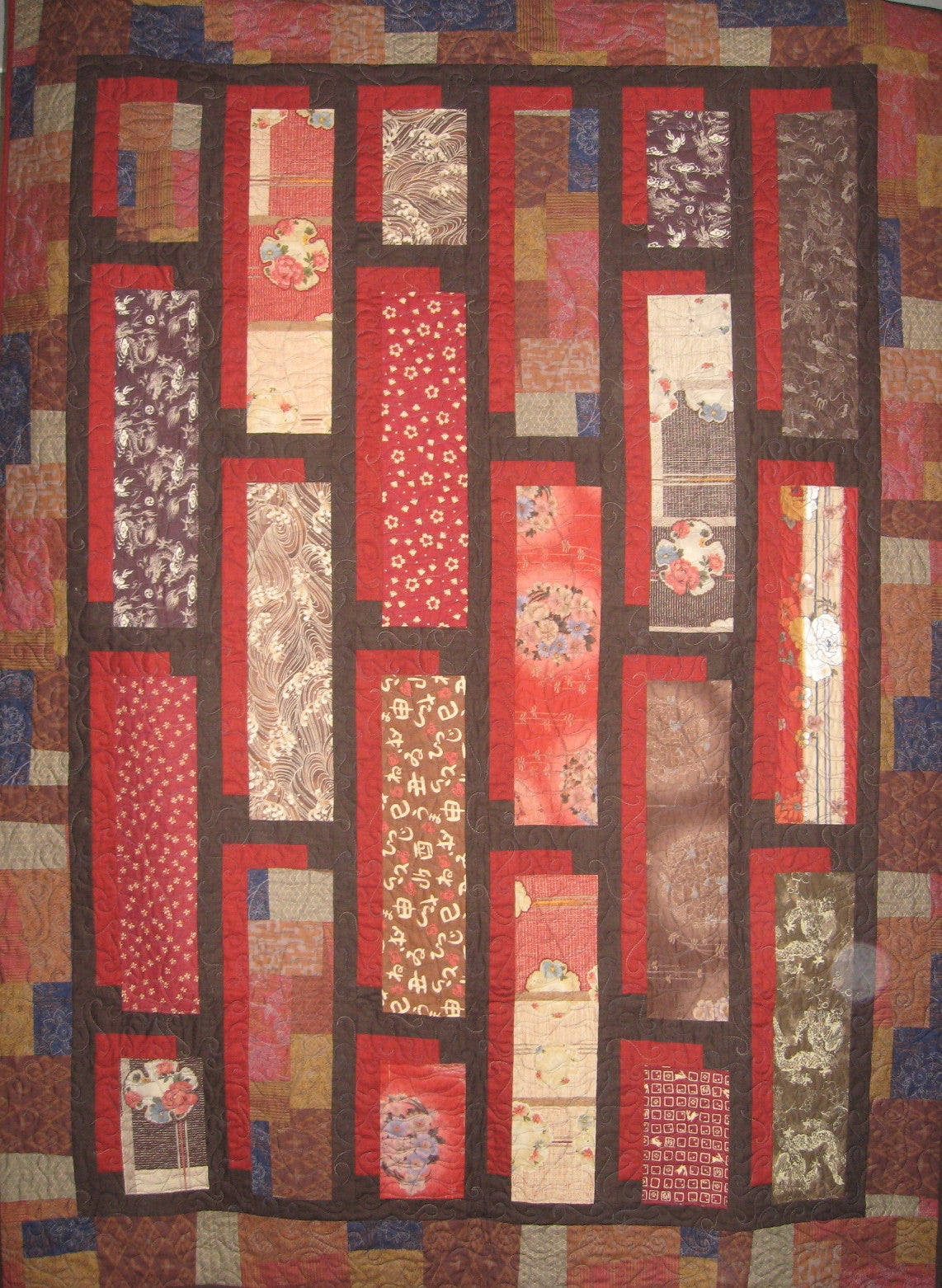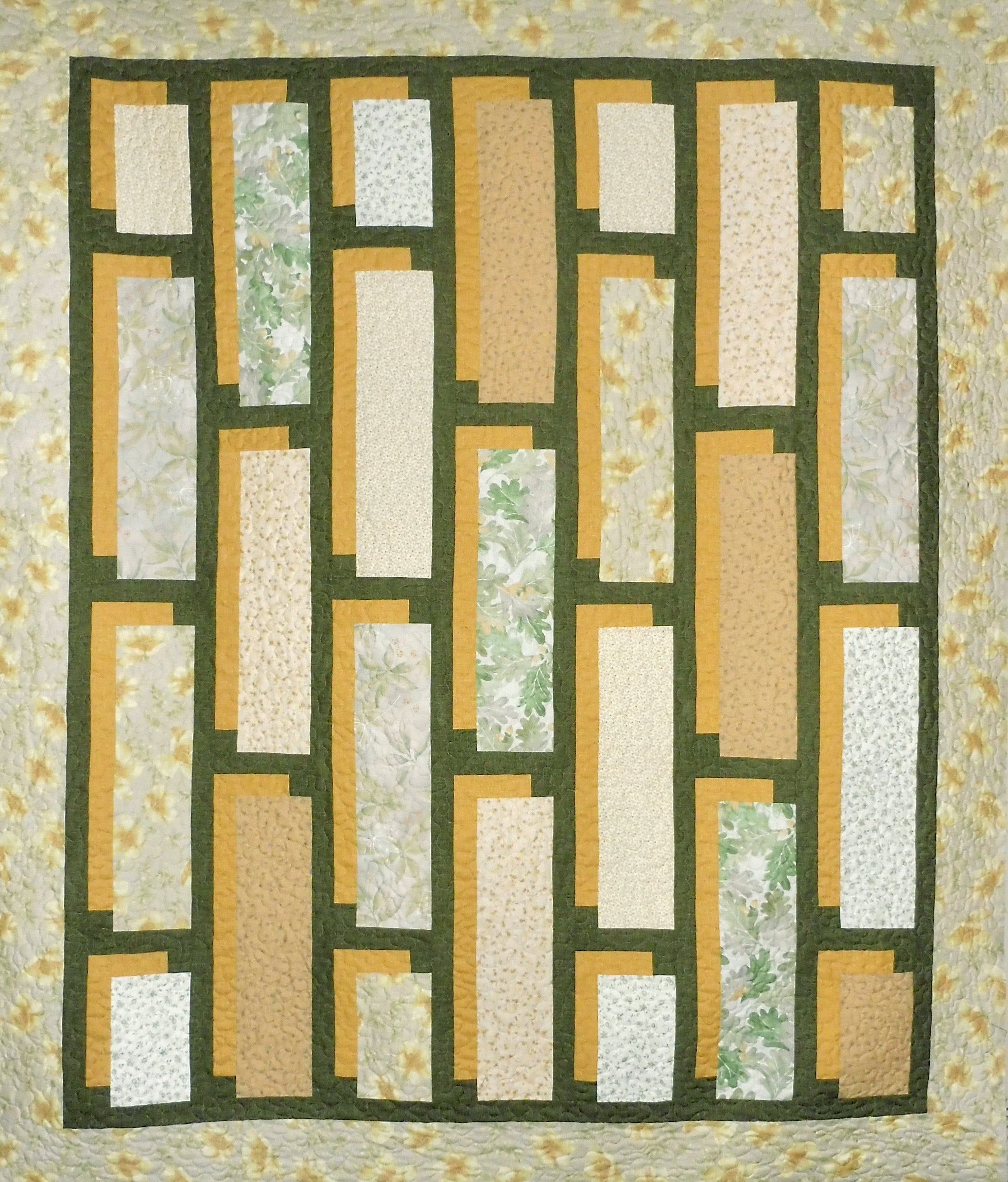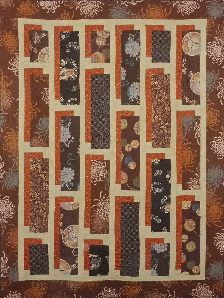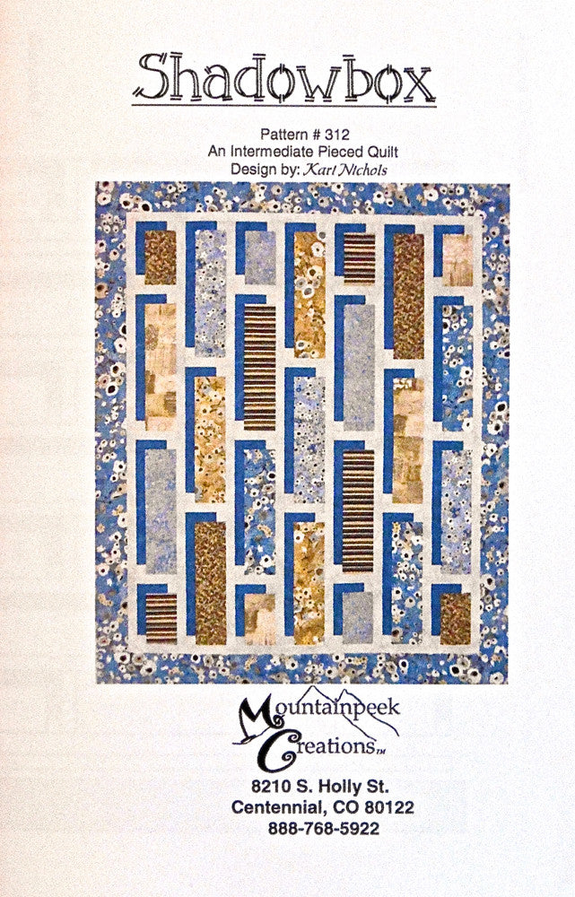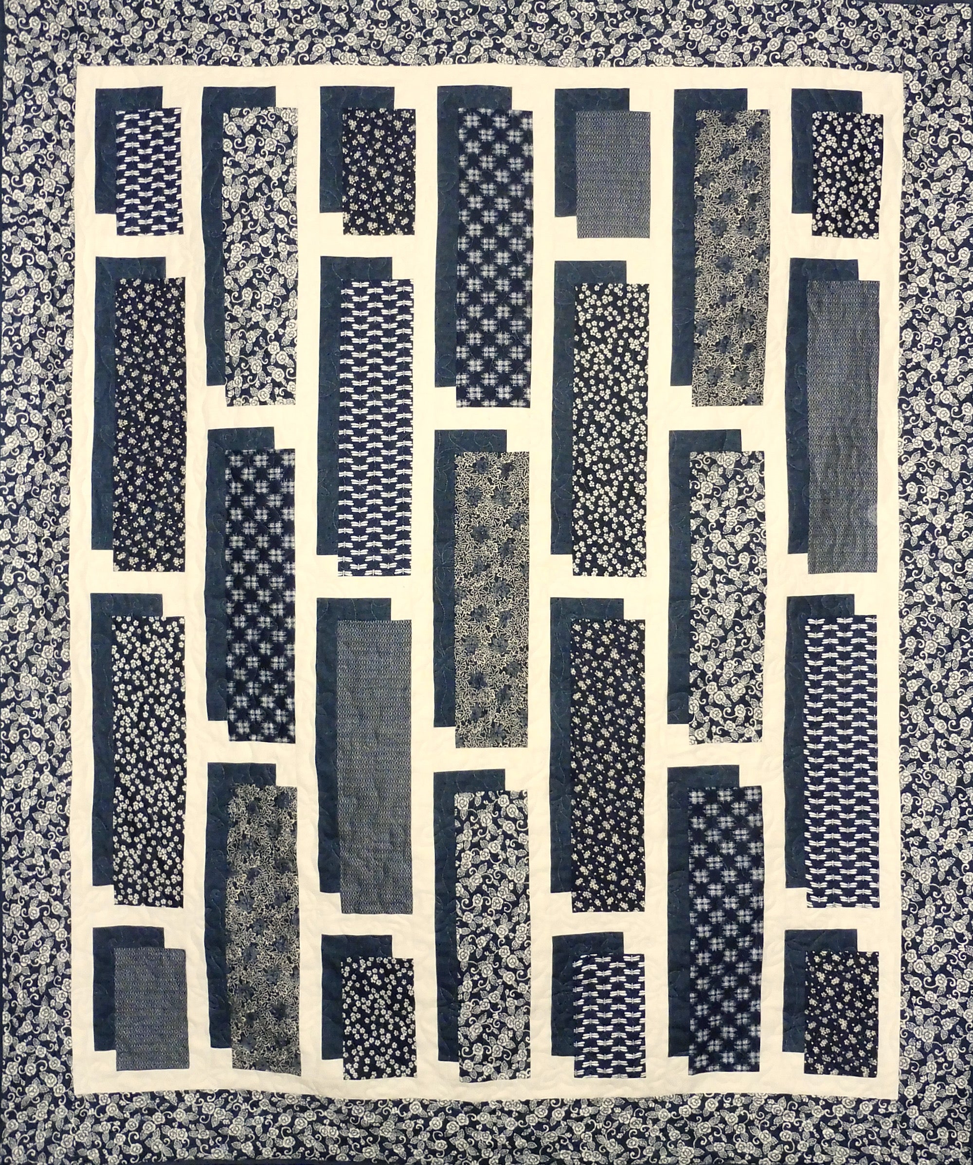 This pattern was designed by Kari Nichols of Mountainpeek Creations. It features staggered rows of elongated rectangles that can showcase a collection, theme print or a selection of large scale prints. Large throw and double bed sizes are included.