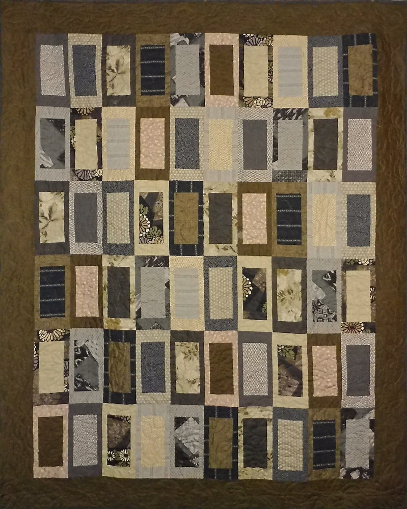 This pattern was designed by Janine Burke of Designs by jb. It's a simple strip pattern that can very effectively showcase any fabric collection, including those with large scale theme prints. The requirements make a very large throw quilt measuring 70" x 88," but can easily change the size by making a different number of blocks.