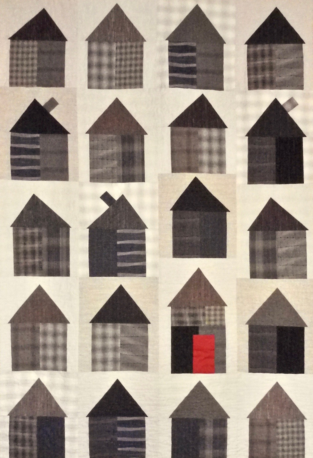 This pattern is designed by Bella Nonna.  Its whimsical houses are a terrific showcase for bright, large scale prints, but you can also use Japanese yarn dyes for a subtler, homespun look.  The pattern makes a wall hanging or small throw quilt measuring 47" x 69," but you can easily adjust the size by adding more rows.