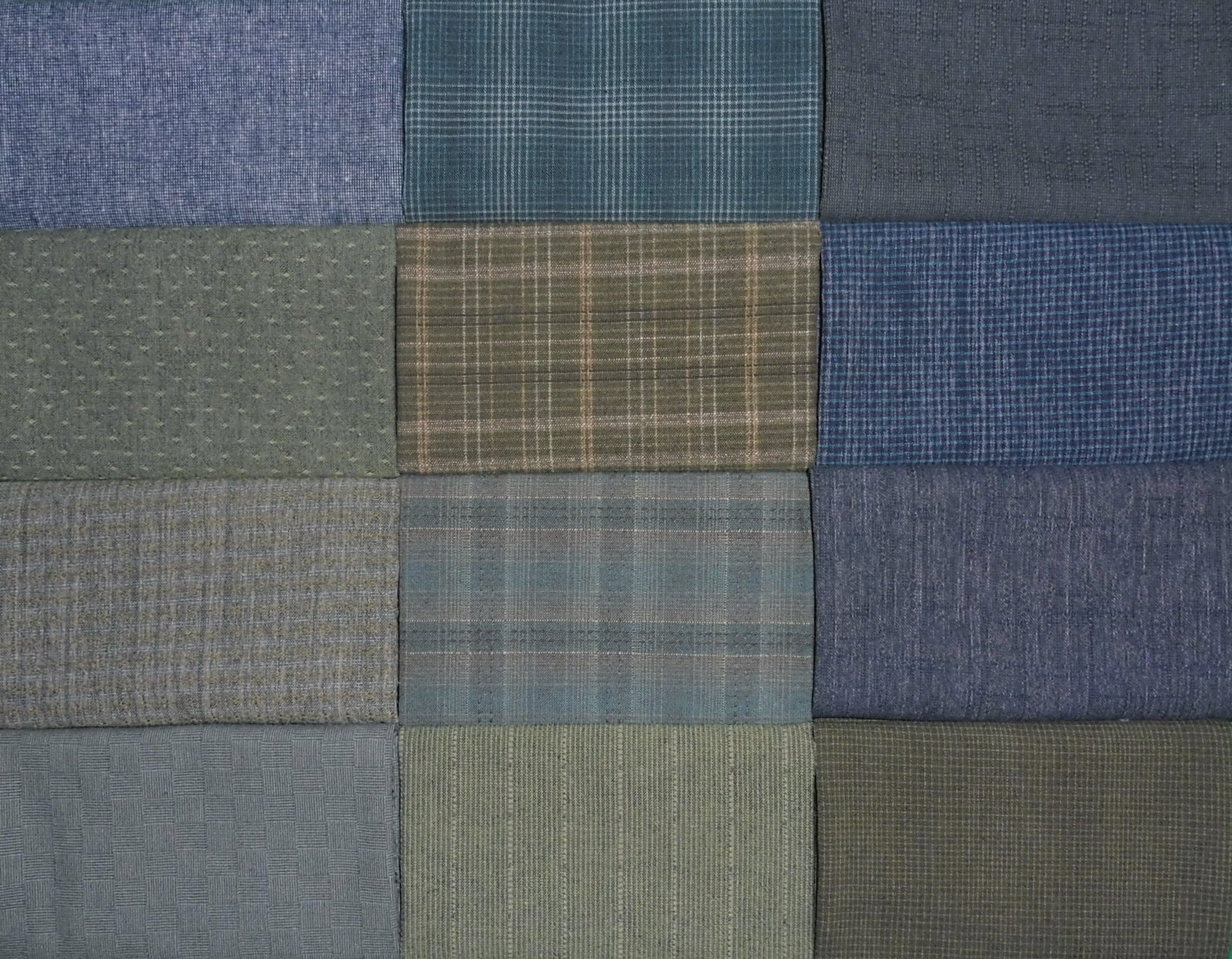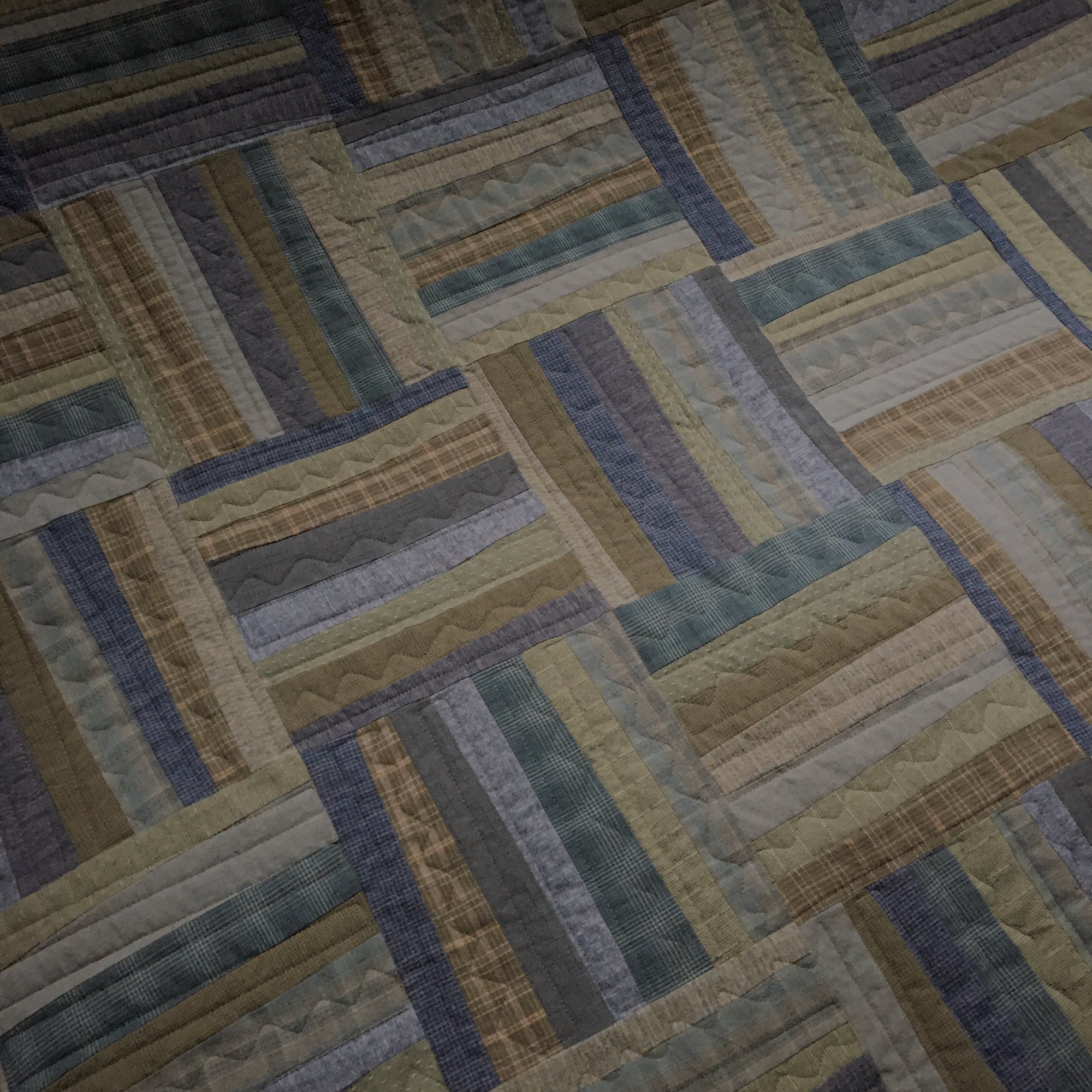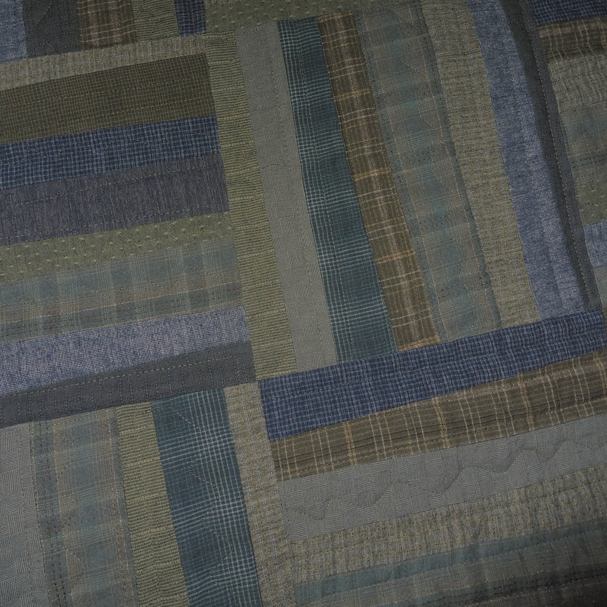 This very popular Janine Burke string quilt pattern features strips of fabric cut crookedly for a great modern look with a nod to the traditional crazy patch quilt. One of two recent versions, this dark one features 12 of the darkest, muddiest blue, teal and green fabrics from the Japanese Yarn Dye collection. The quilt finishes approximately 55" x 73," which is appropriate for a throw.