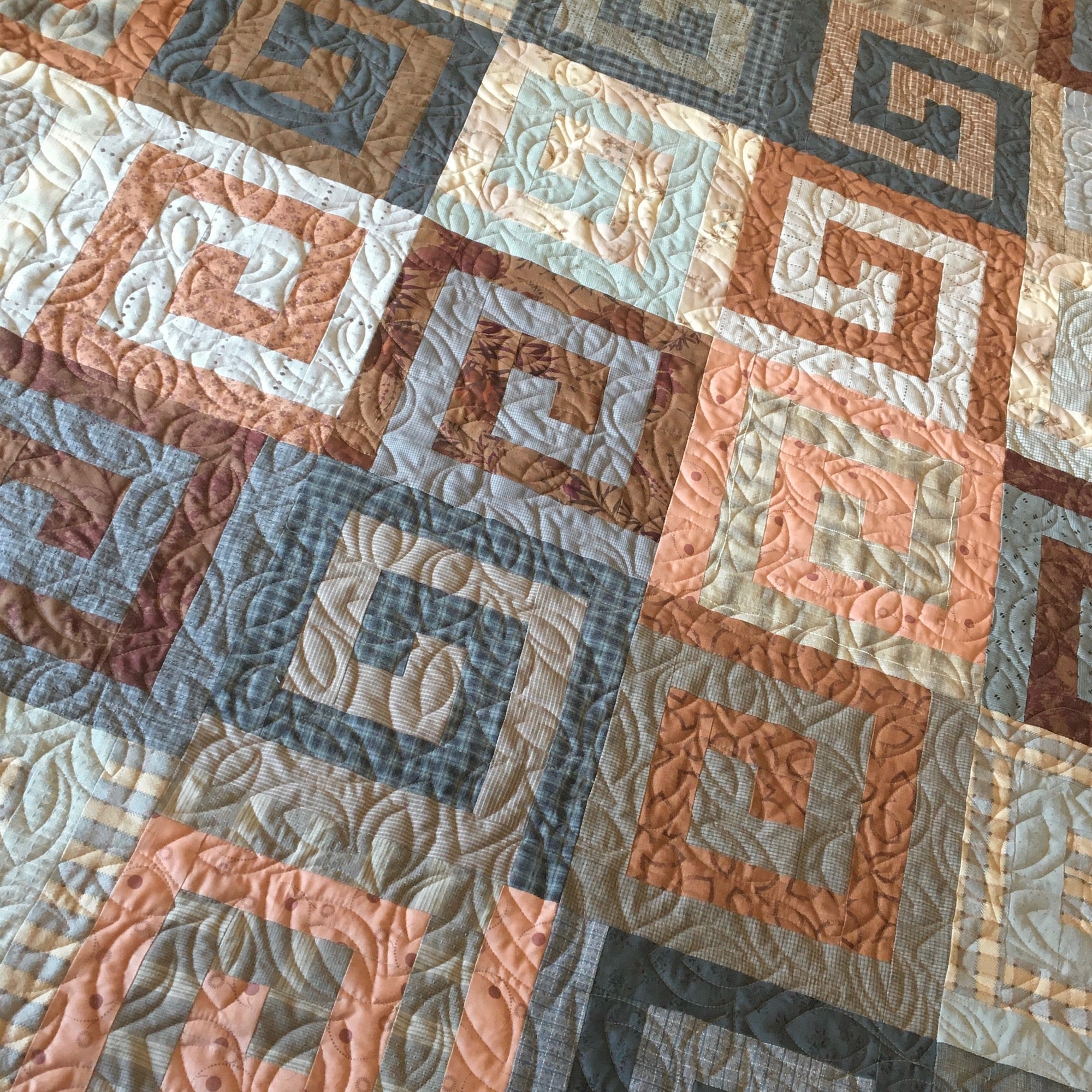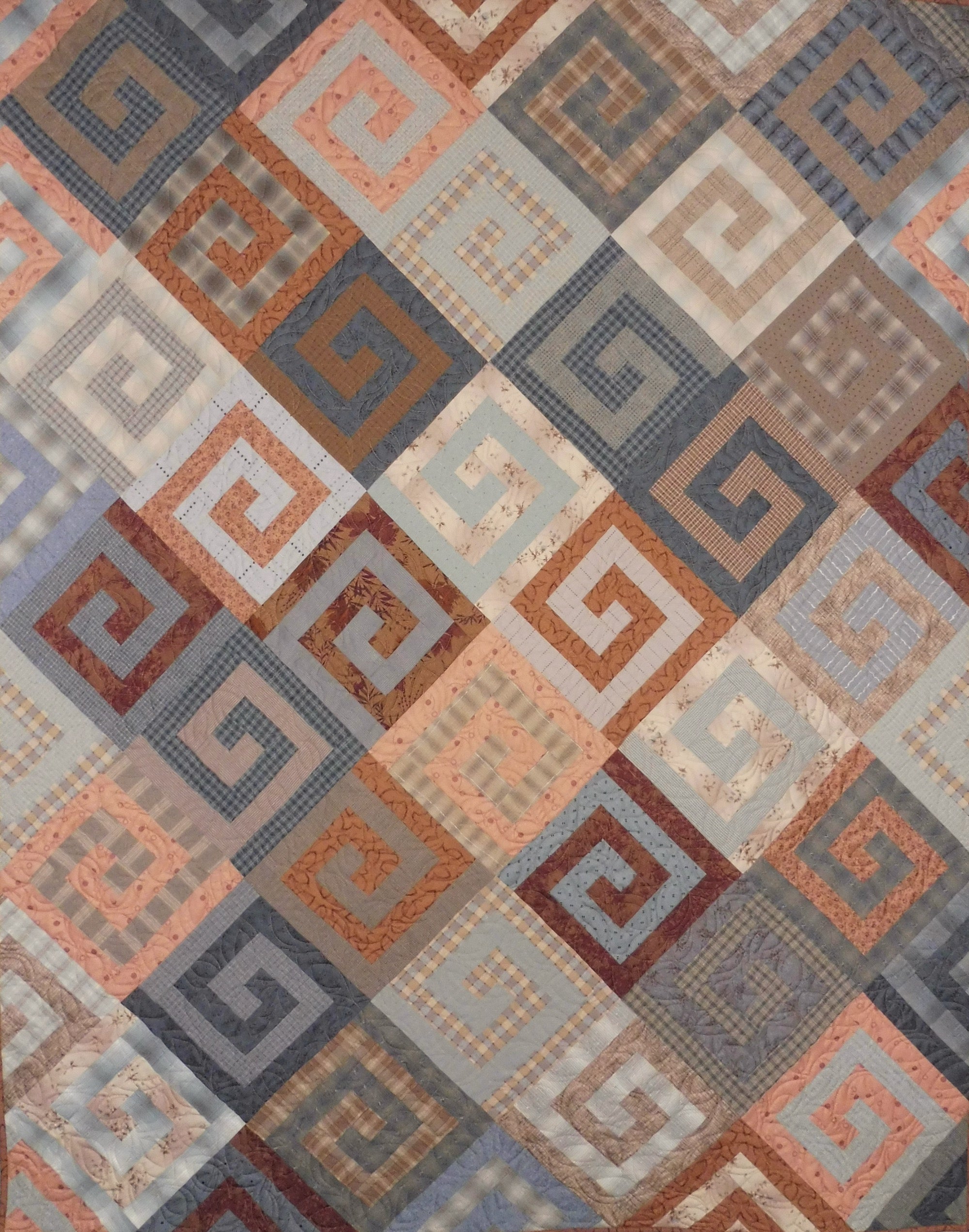 This quilt features dozens of Japanese blender prints and yarn dyes in shades of blue, grey, peach and rust. This pattern called Athena's Puzzle was designed by Janine Burke of Designs by jb and is a variation on the traditional Greek Key in a diagonal setting. It measures 56.5" x 72," which is appropriate for a large throw.
