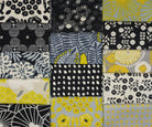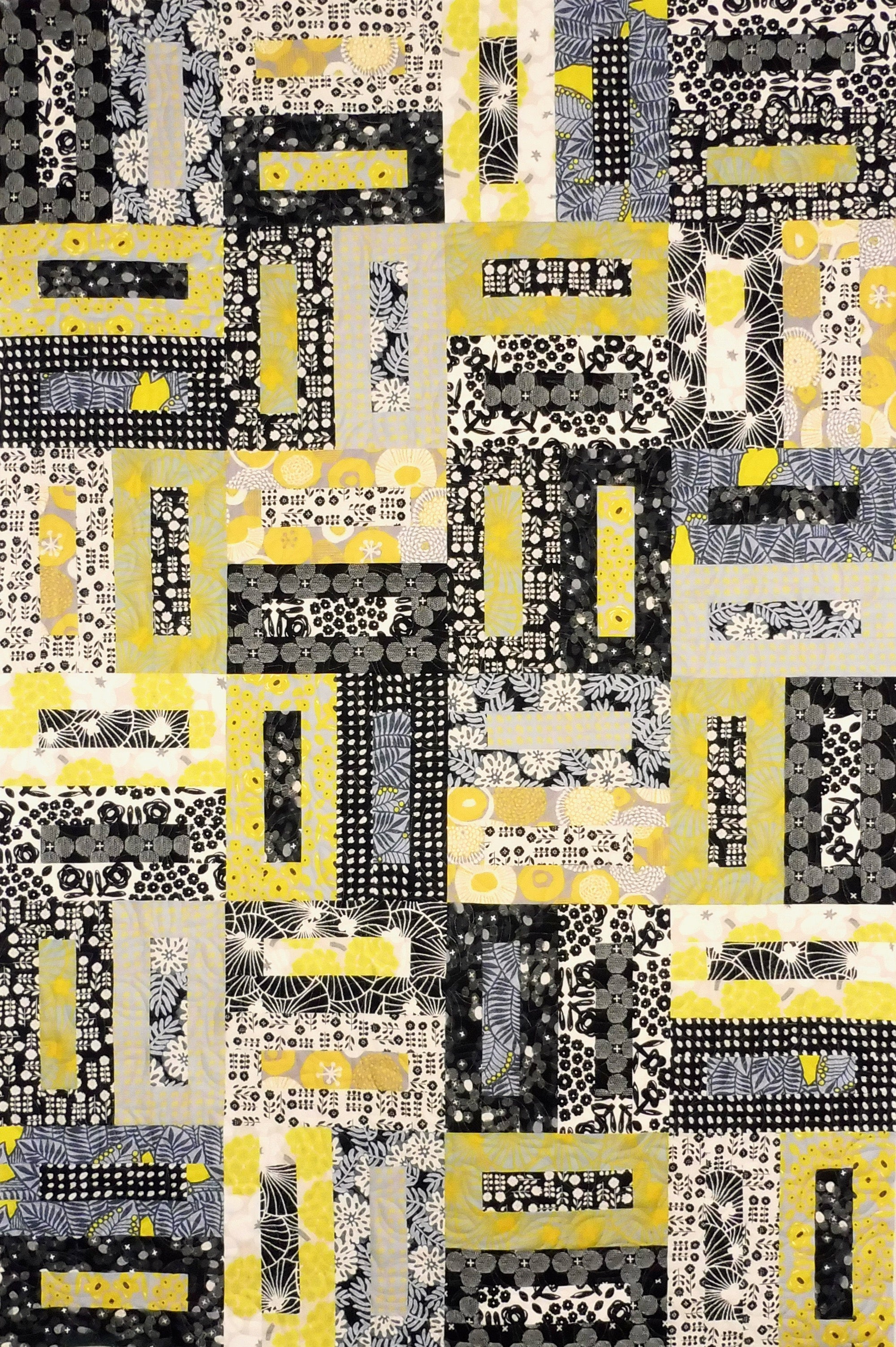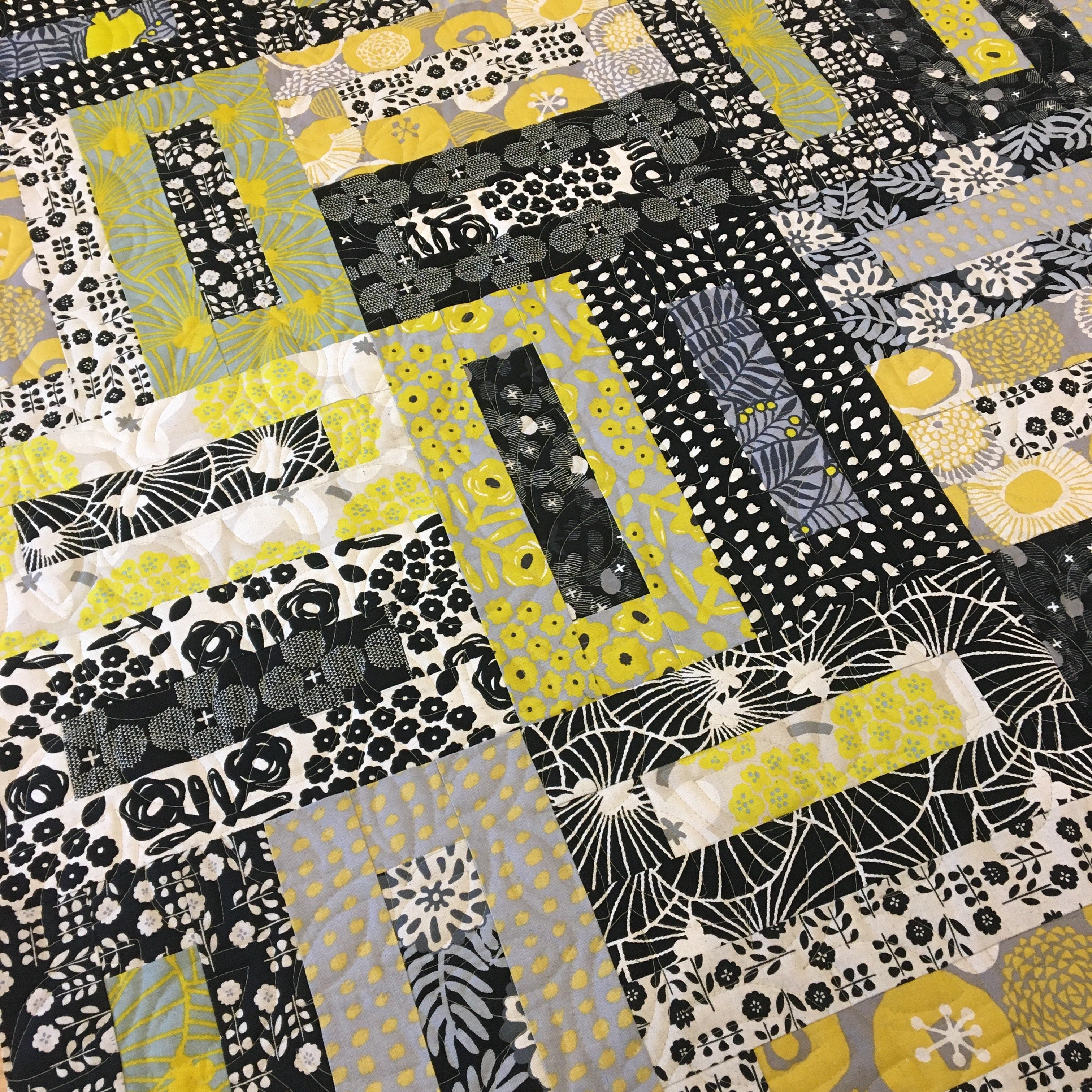 This is my second version of Batik Bricks using modern Japanese cotton/linen blend prints, this time in black and yellow. The quick and simple pattern was designed by Nellie Holmes and Christine Baker of Upper Canada Quiltworks. It's a bold design that can showcase batiks, as shown on the pattern cover, or any other fabric selection, but especially large scale prints, such as the Japanese cotton/linen modern print collection. This throw quilt measuring appropriately 48" wide x 72" long.