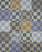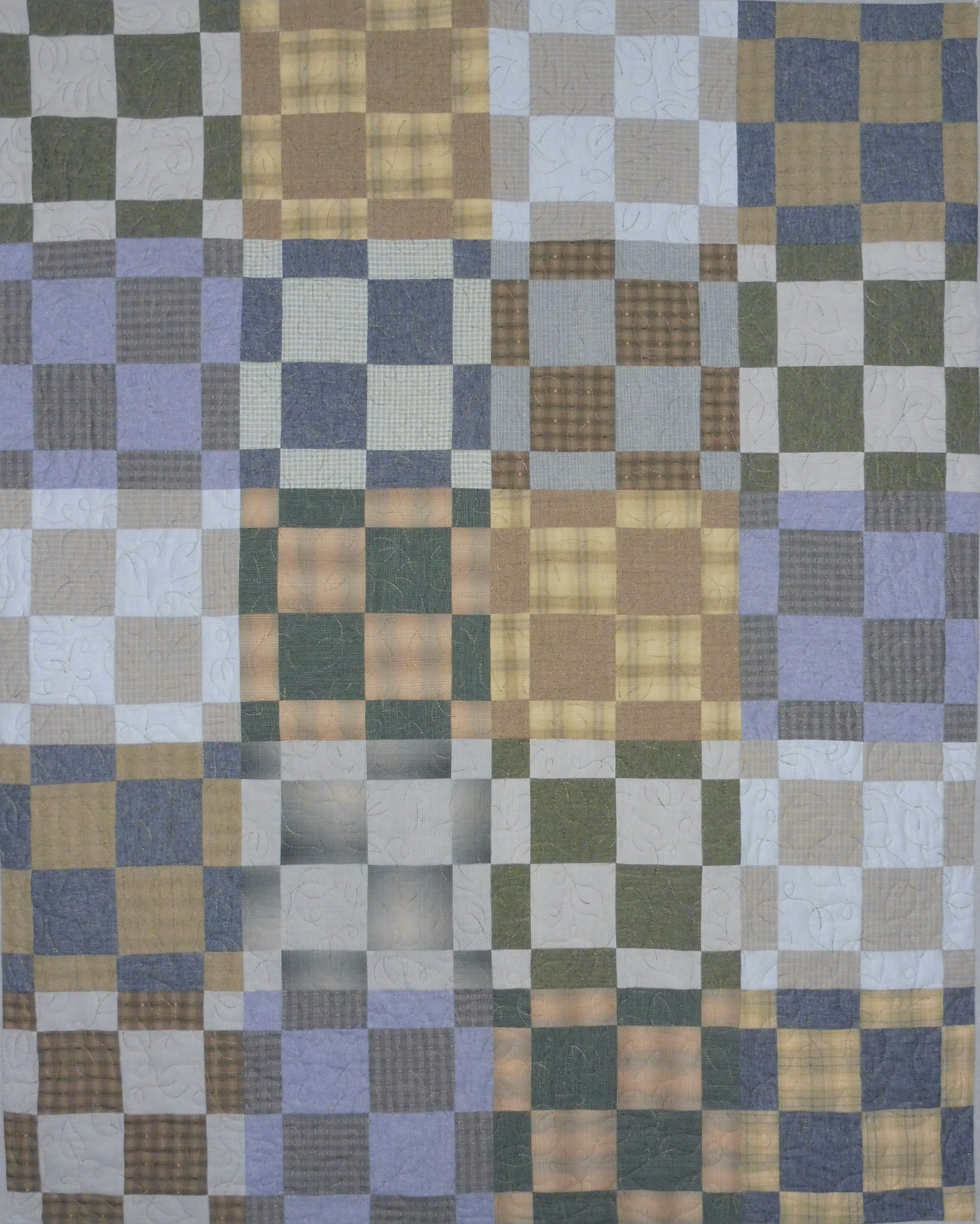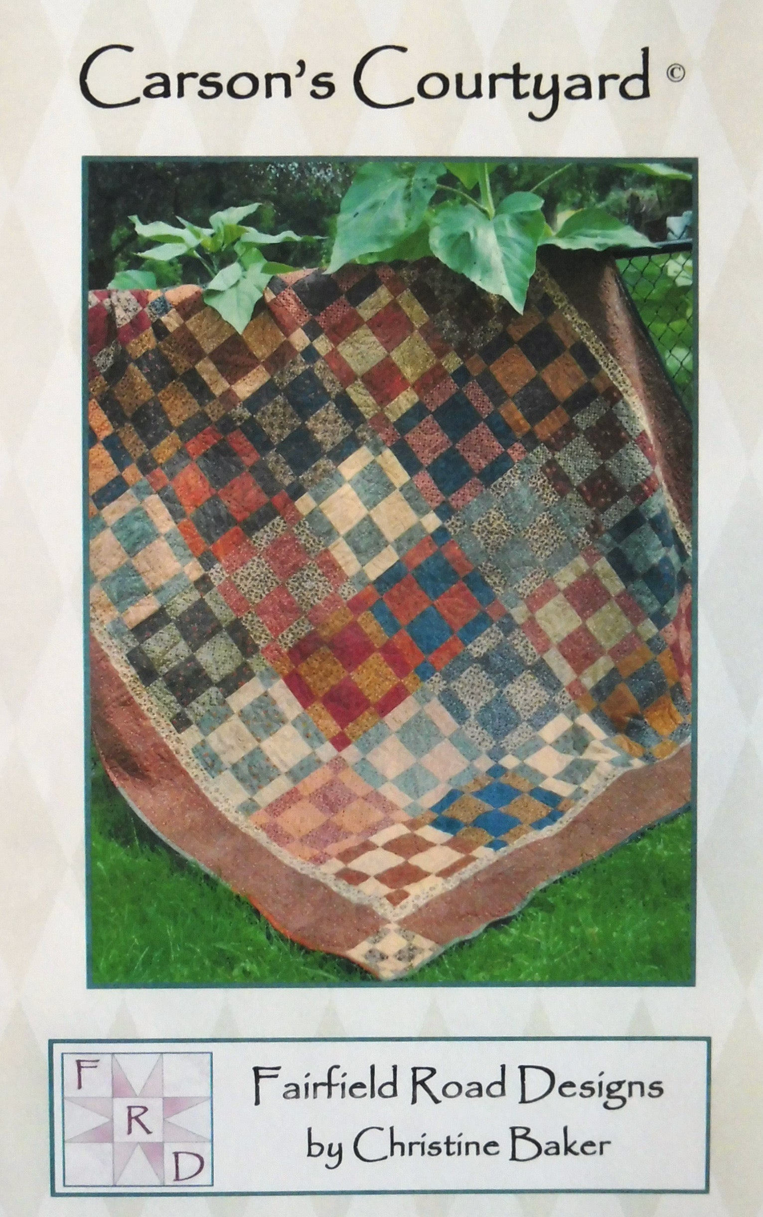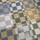This quilt features gorgeous plush yarn dyed fabrics from Japan.  Colours are shades of green, aqua and blue.  The pattern called Carson's Courtyard was designed by Christine Baker of Fairfield Road Designs and Upper Canada Quiltworks - it is available for purchase - and my store sample is being sold with permission.  This quilt measures 43" x 55" and is appropriate for a lap quilt. The machine quilting in a coordinating variegated cotton thread can be seen in the close up photo.  The backing is a large beige and blue check with a strip of a tiny aqua grid, same as the binding, along one edge.
