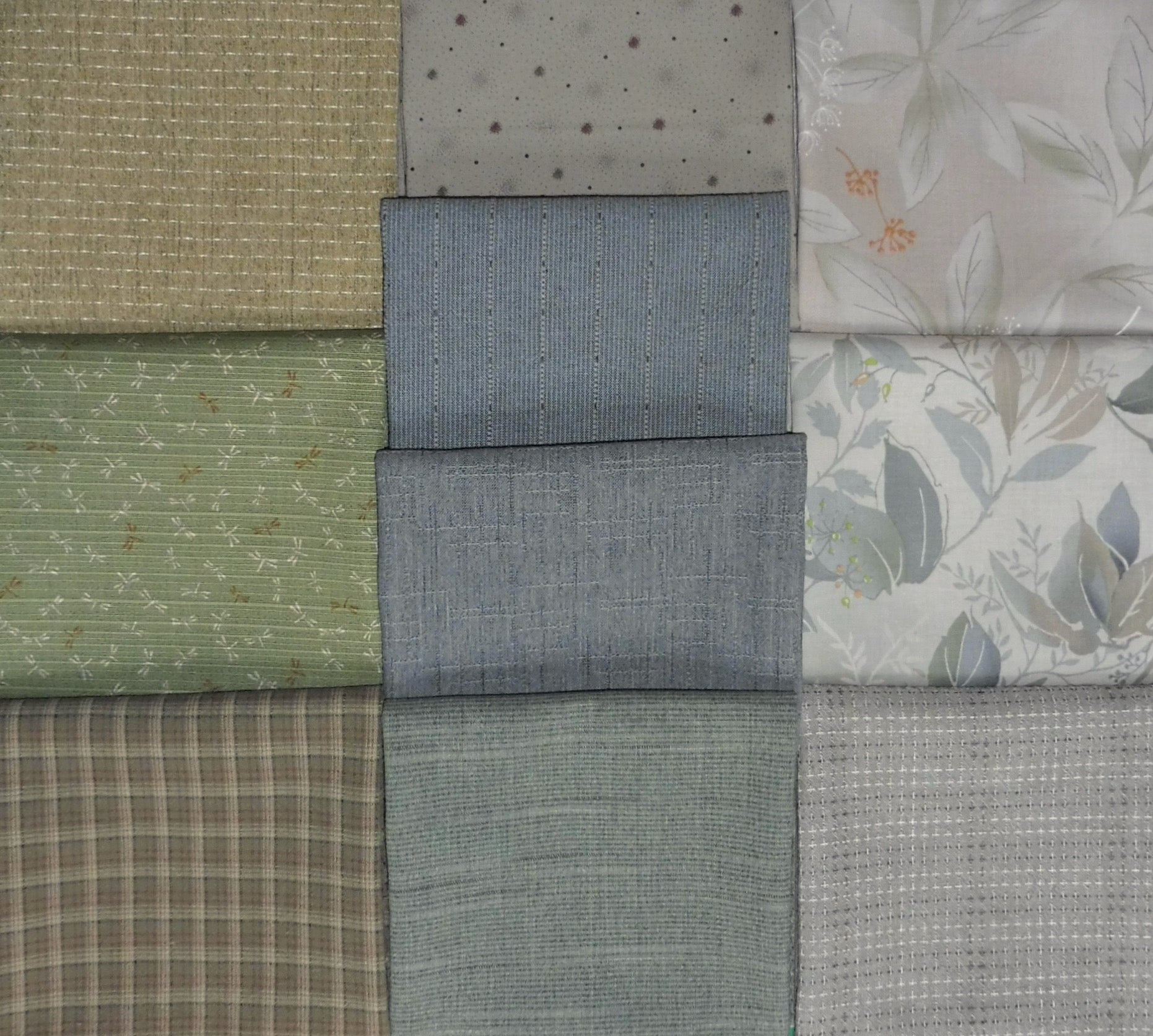 This quilt features a calm and soothing palette of Japanese quilting prints, textured dobby prints and yarn dyes in soft green and grey. This popular pattern was designed by Kari Nichols and my recently retired store sample is being sold with permission. It finishes approximately 58" x 93," which is appropriate for a large throw or short twin bed. The free motion machine quilting can be better seen in the close up photo.