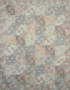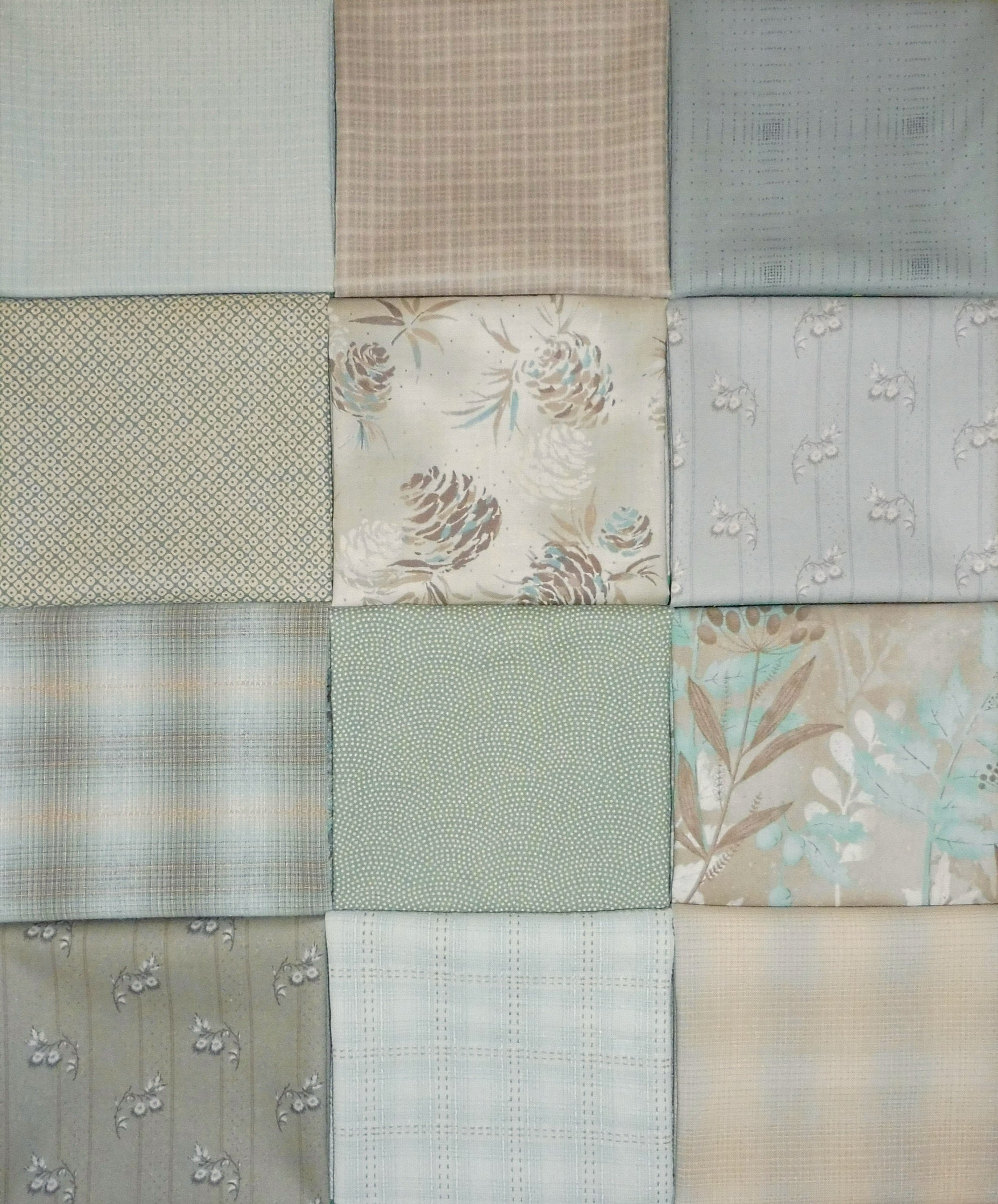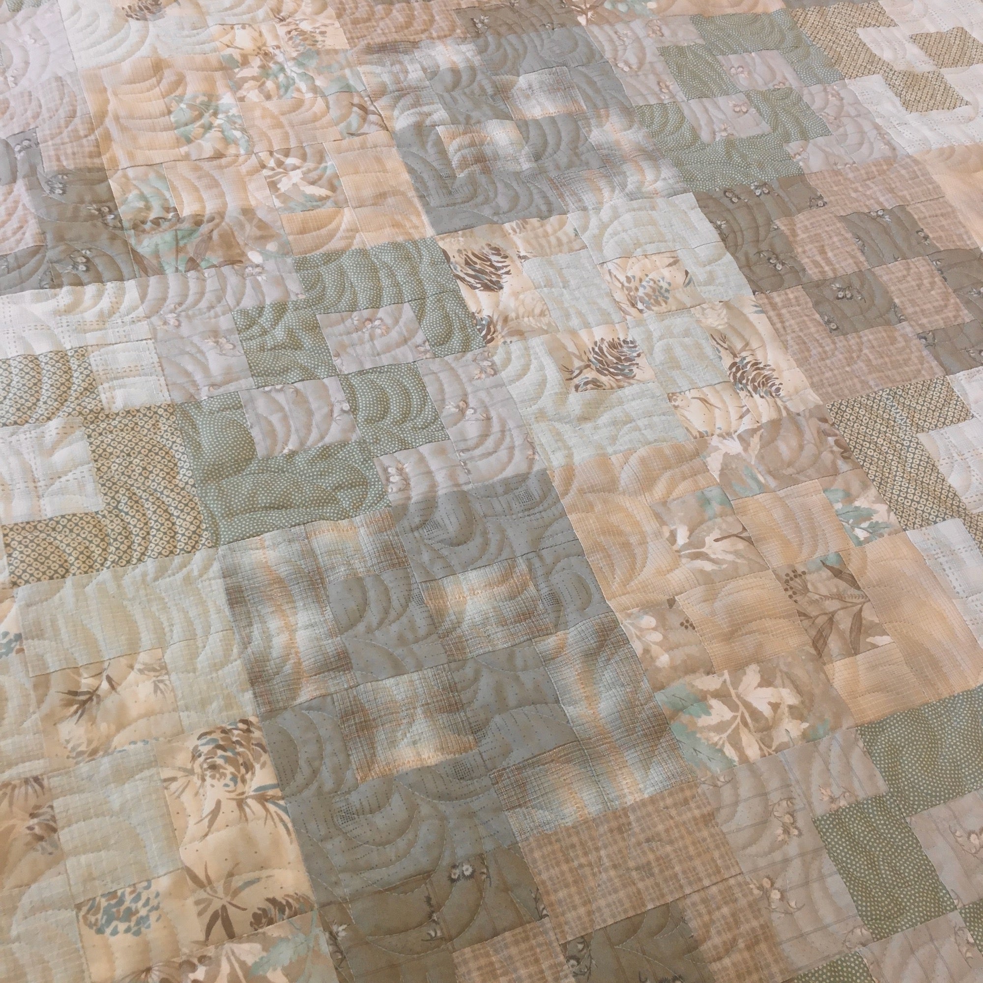 This quilt pattern is a loose variation on Log Cabin called Eclipse and was created by designer Janine Burke of Designs by jb.  Kallisti's most recent store sample features a lovely soft palette of blue, aqua and green fabrics from three different Japanese collections, including traditional prints, blender prints and yarn dyes.  The size is approximately 56" x 72," which is appropriate for a throw.