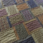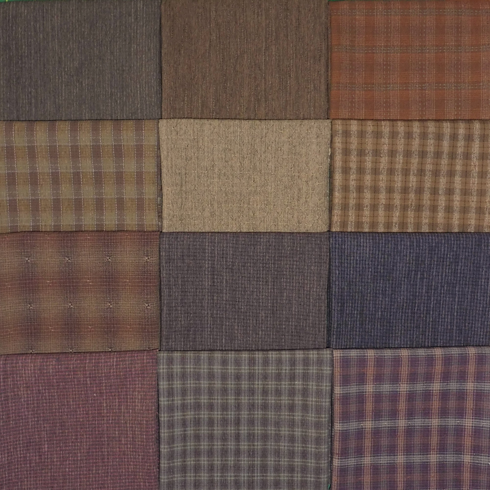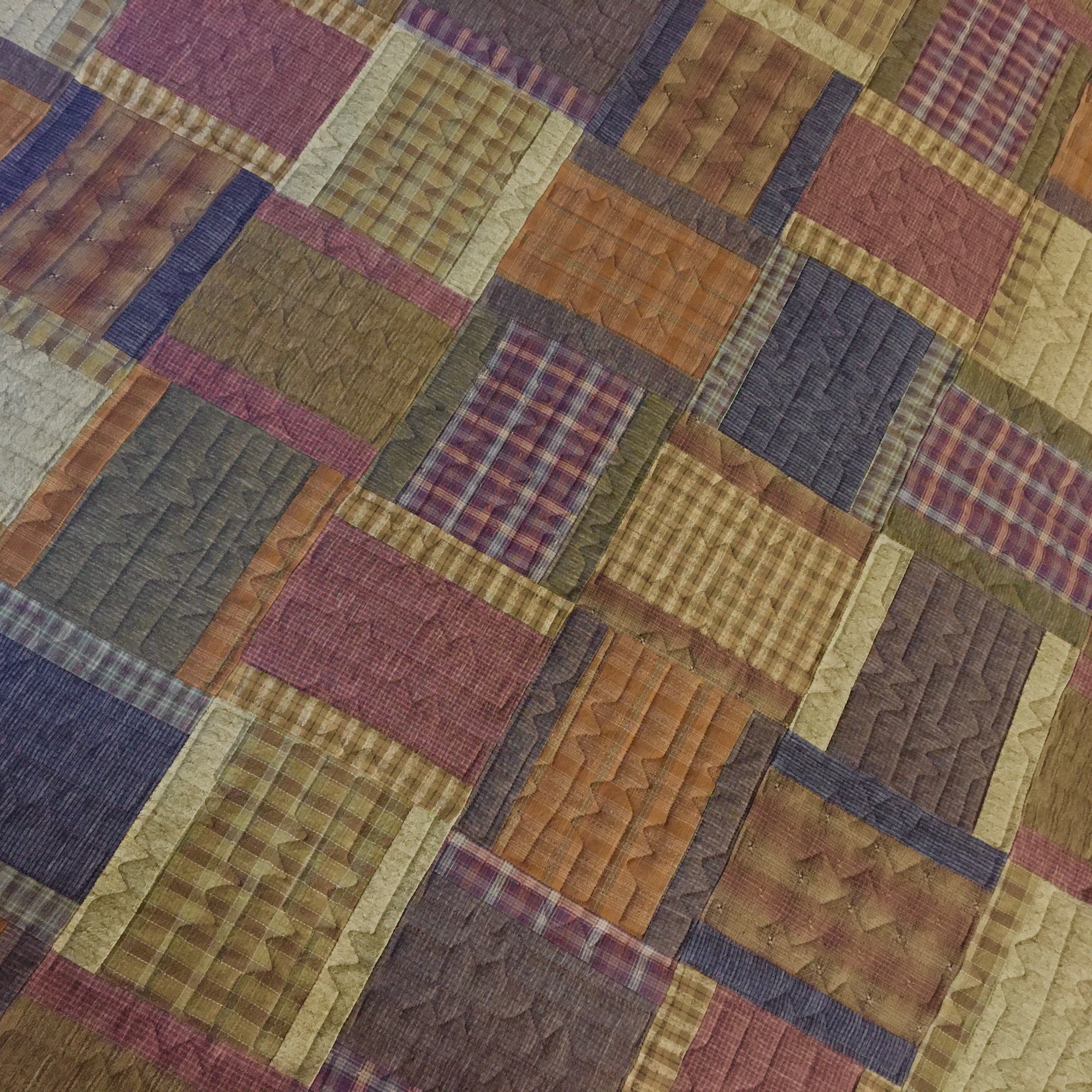 Kallisti's new version of Equinox features a warm palette of rust, brown and tones of dark purple from the Japanese yarn dye fabric collection.  The pattern was designed by Janine Burke of Designs by jb and the pattern is available for purchase separately.  My retired store sample is being sold with permission.  The quilt measures approximately 48" x 72" and is appropriate for a throw.
