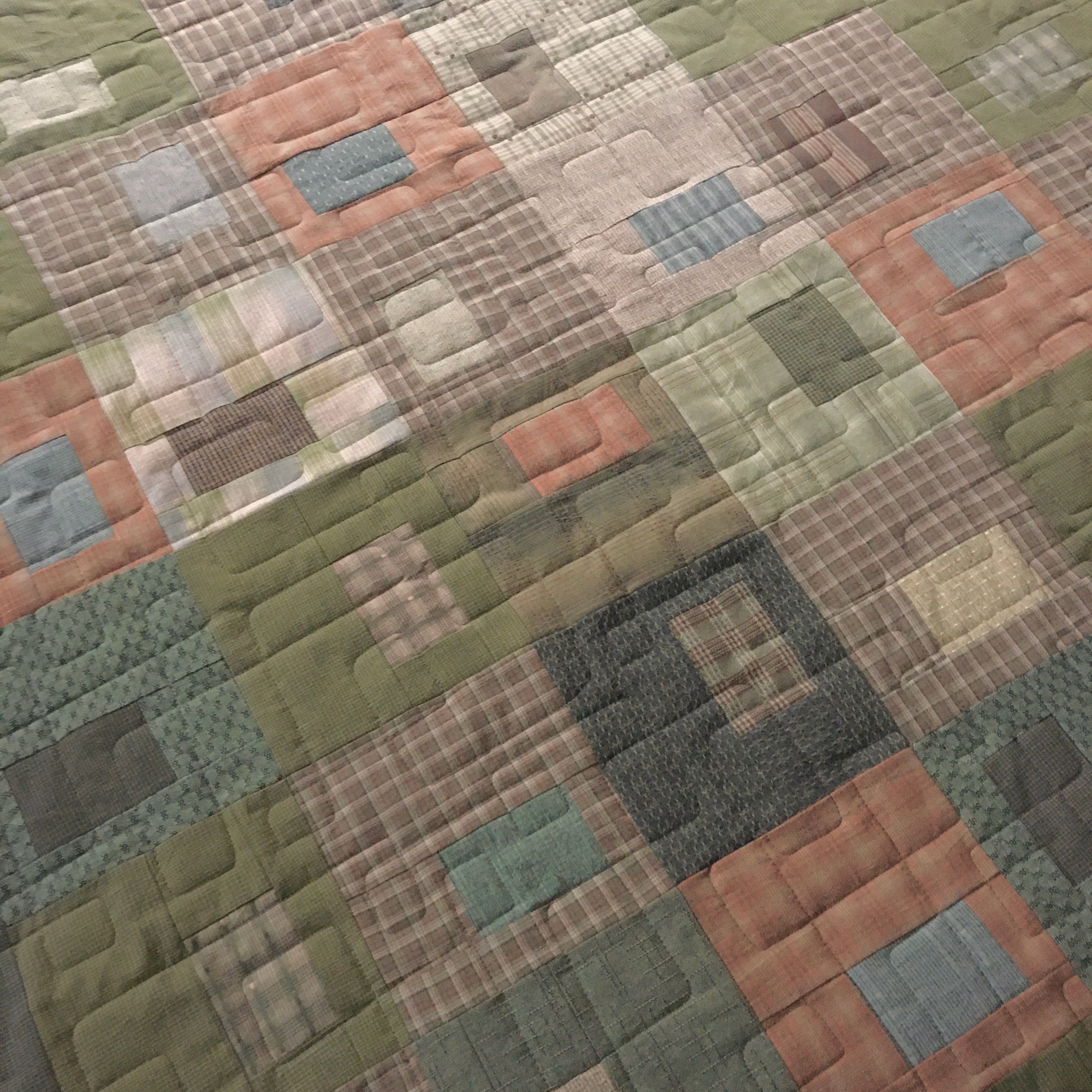 This pattern was designed by Janine Burke of Designs by JB.  It's a simple graphic pattern that continues to be a best seller.  It looks great in any fabric combination, but Kallisti's latest version is made with gorgeous Japanese yarn dyes in shades of green and clay.  It measures approximately 43" x 55" and is appropriate for a throw.