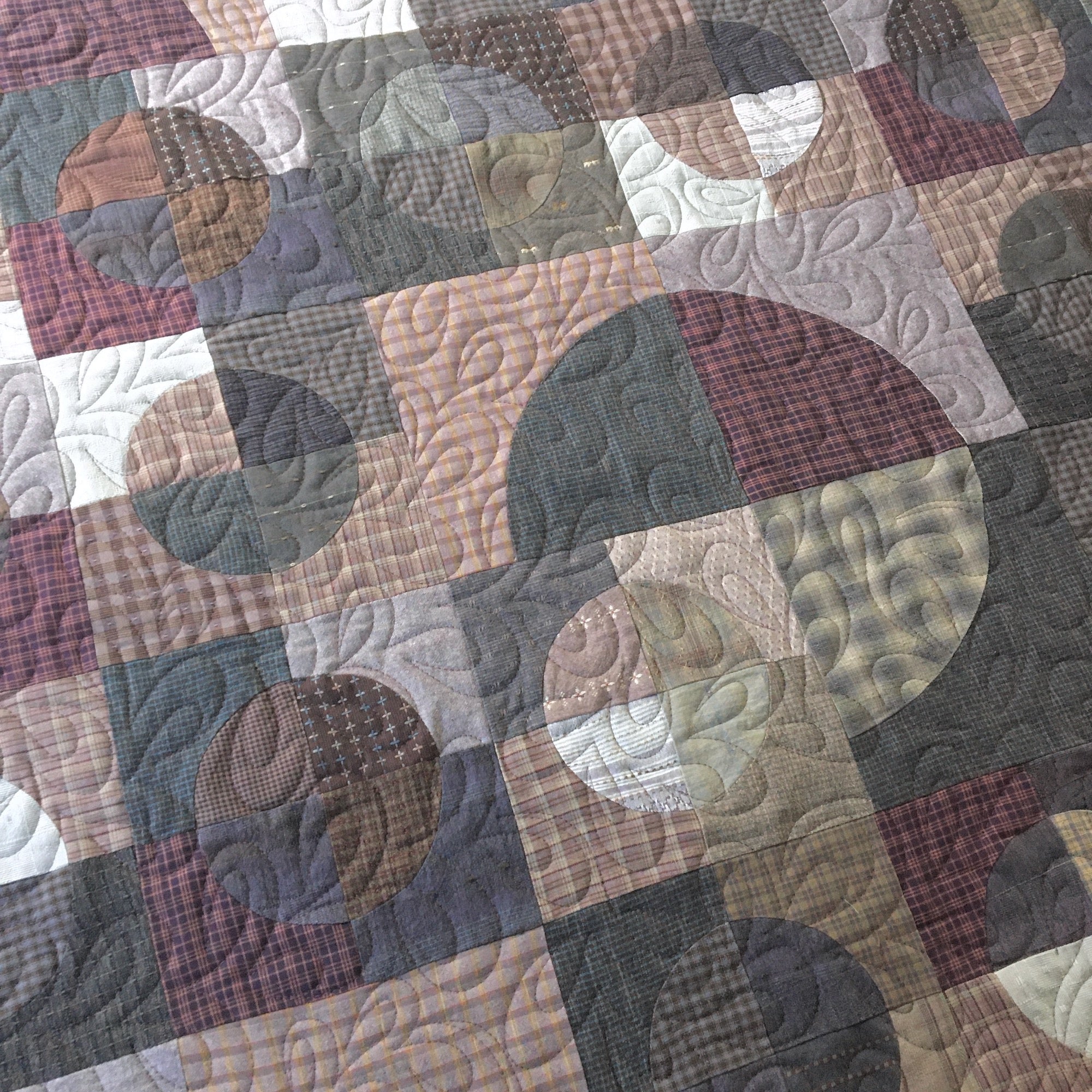 This quilt features many Japanese yarn dyed fabrics in shades of muted purple, mauve and grey.  The pattern called Lunar Eclipse is a Drunkard's Path variation and was designed by Upper Canada Quiltworks - it is available for purchase.  My store sample is being sold with permission.  This quilt measures 43" x 57.5" and is appropriate for a lap quilt. The machine quilting can be better seen in the close up photo.