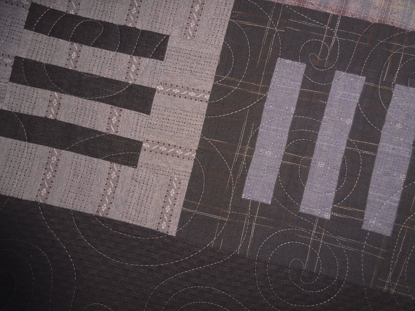 This quilt features gorgeous textured yarn dyed fabrics from Japan in a range of warm brown and rare purple and mauve. The pattern called Modern Thinking was designed by Janine Burke of Designs by jb - it is available for purchase - and my retired store sample is being sold with permission. This quilt measures 64" x 80" and is appropriate for a large throw.