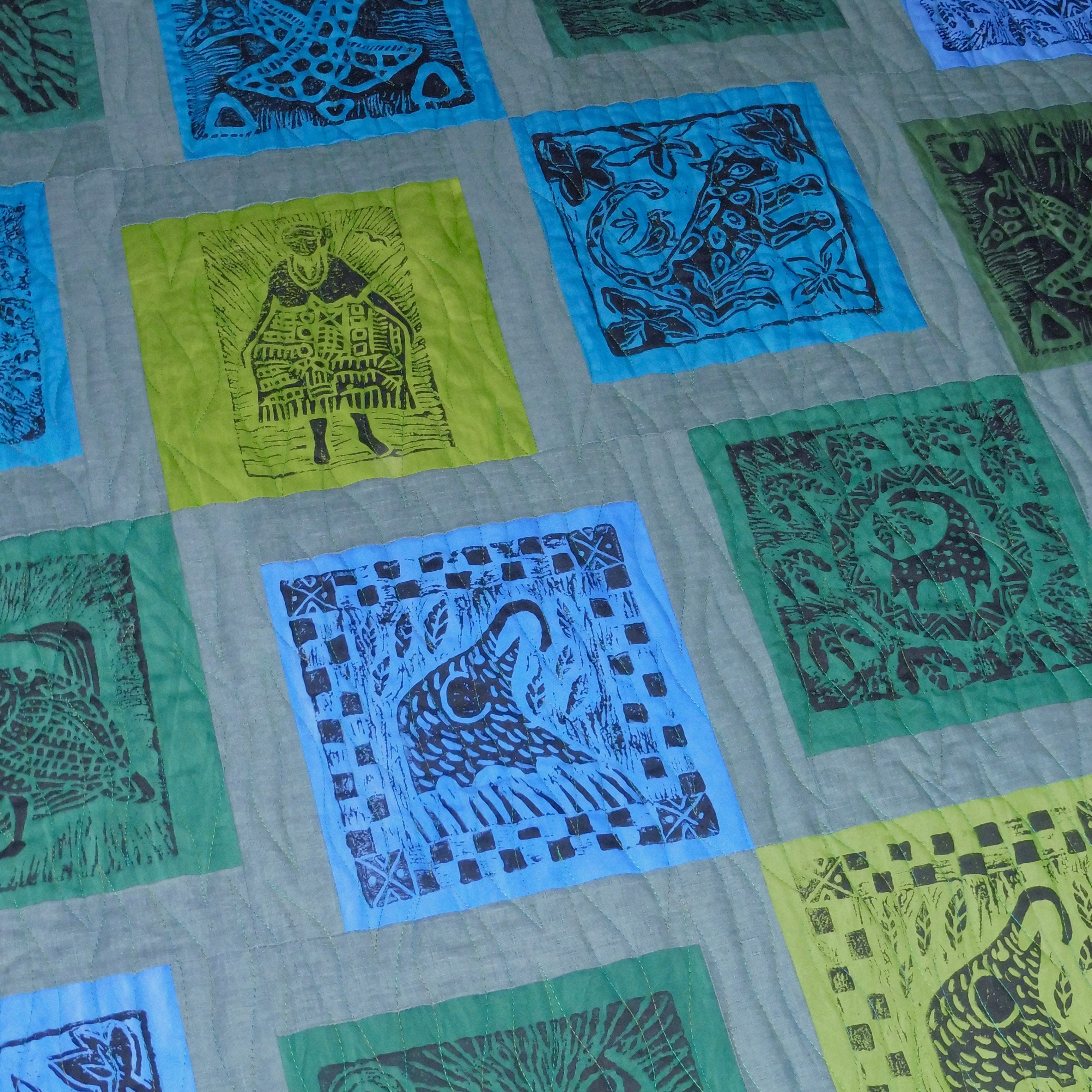 This is the most recent version of my South African batik panel quilt. It features 20 different blue and green handmade South African panels set in an off-centred greyish blue grid for a modern, whimsical look. It measures approximately 55" x 67," which is appropriate for a throw quilt.