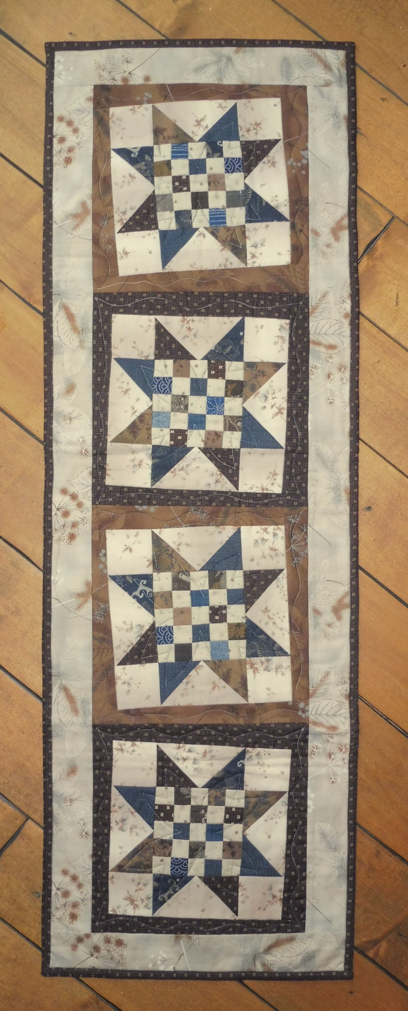 This table runner features fabrics from my very first Japanese blender print collection from Yoko Saito and mixed with dobby prints. Colours are taupe, brown and dark blue. The runner measures approximately 48" wide x 16" deep.