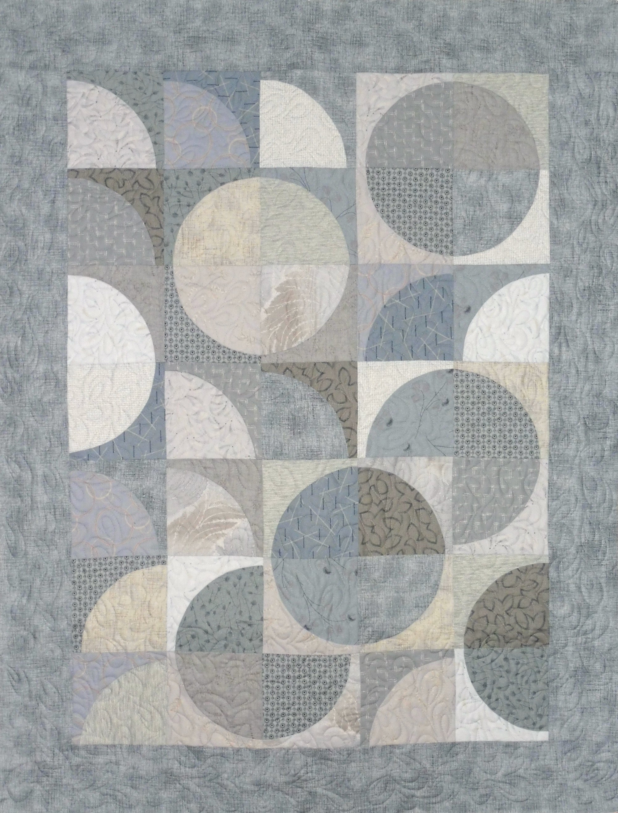 Kallisti's recent version of Curves of Desire features a lovely soft palette of light to medium blue Japanese Blender prints. This pattern was designed by quilt teacher Fran O'Neill and is available for purchase separately. It's a variation of the traditional Drunkard's Path block and finishes approximately 38" x 51," which is appropriate for a lap, small throw or baby quilt.
