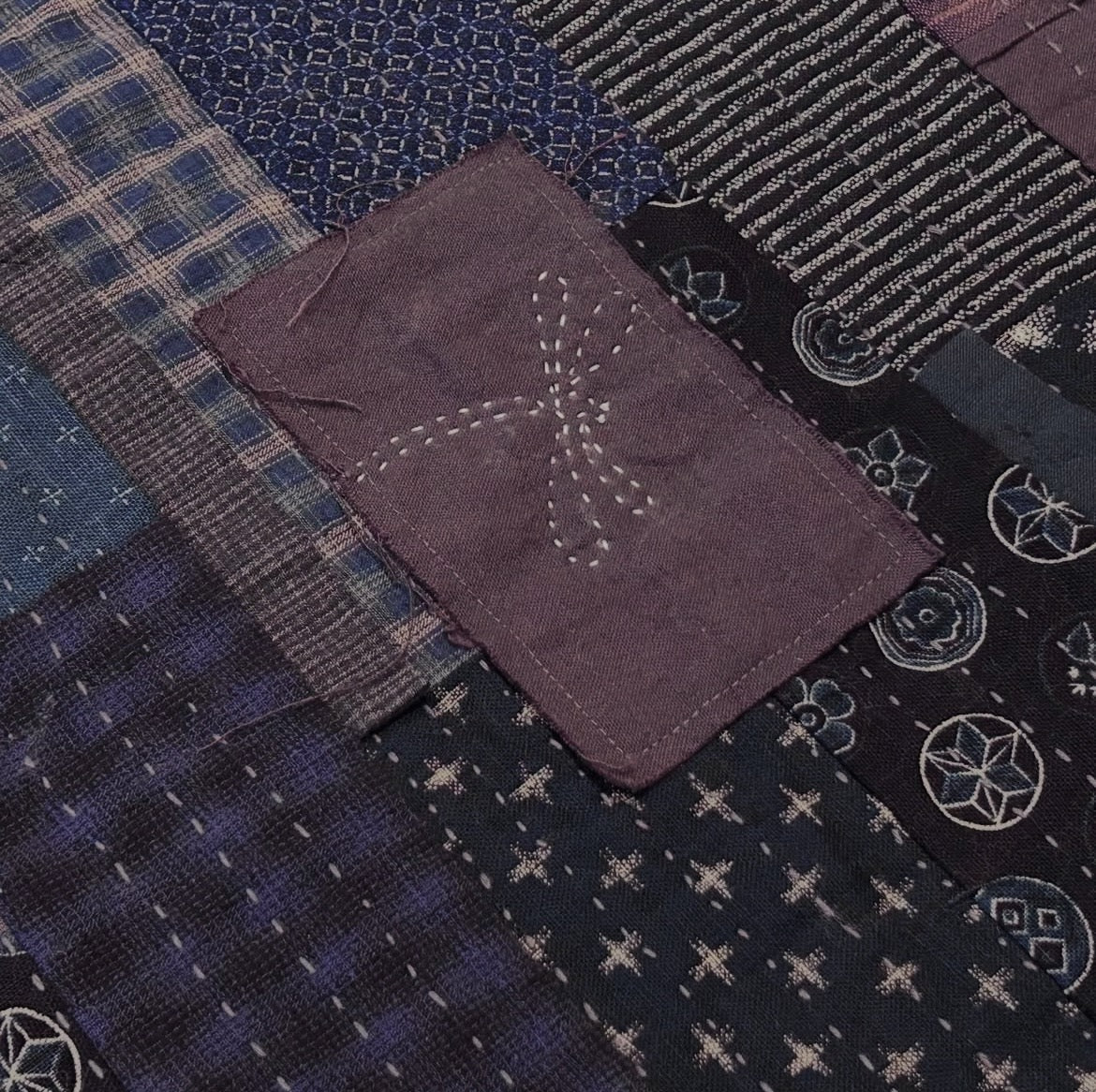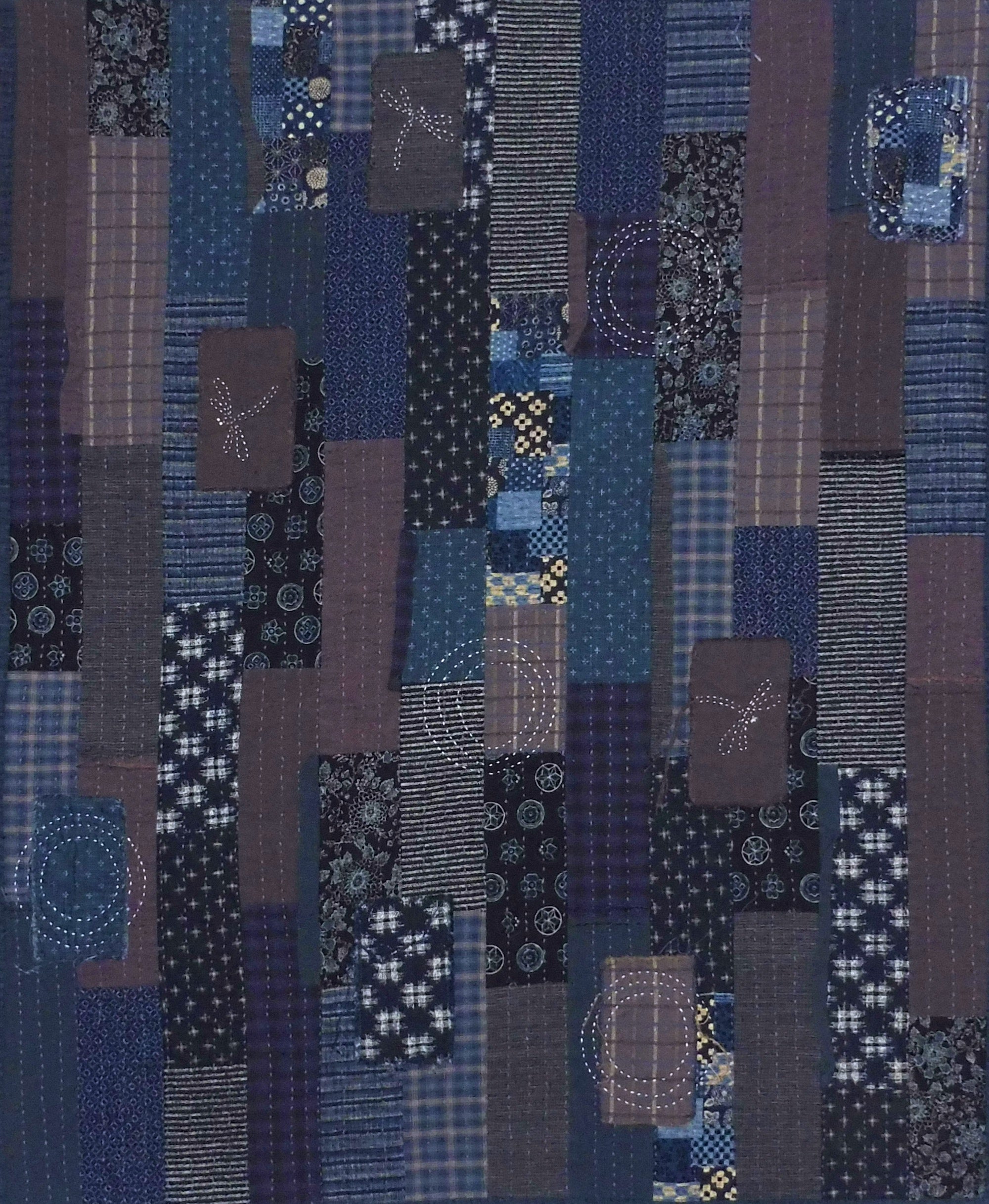 Kallisti used Bella Nonna's Color Splash pattern to create a Japanese boro style quilt kit. The quilt features 16 Japanese dobby and yarn dye fabrics in shades of blue and muddy purple, one bulk skein of muddy plum thread, pattern plus tips to add boro style features. This quilt measures approximately 34" x 42," which is appropriate for a wall hanging or lap quilt.