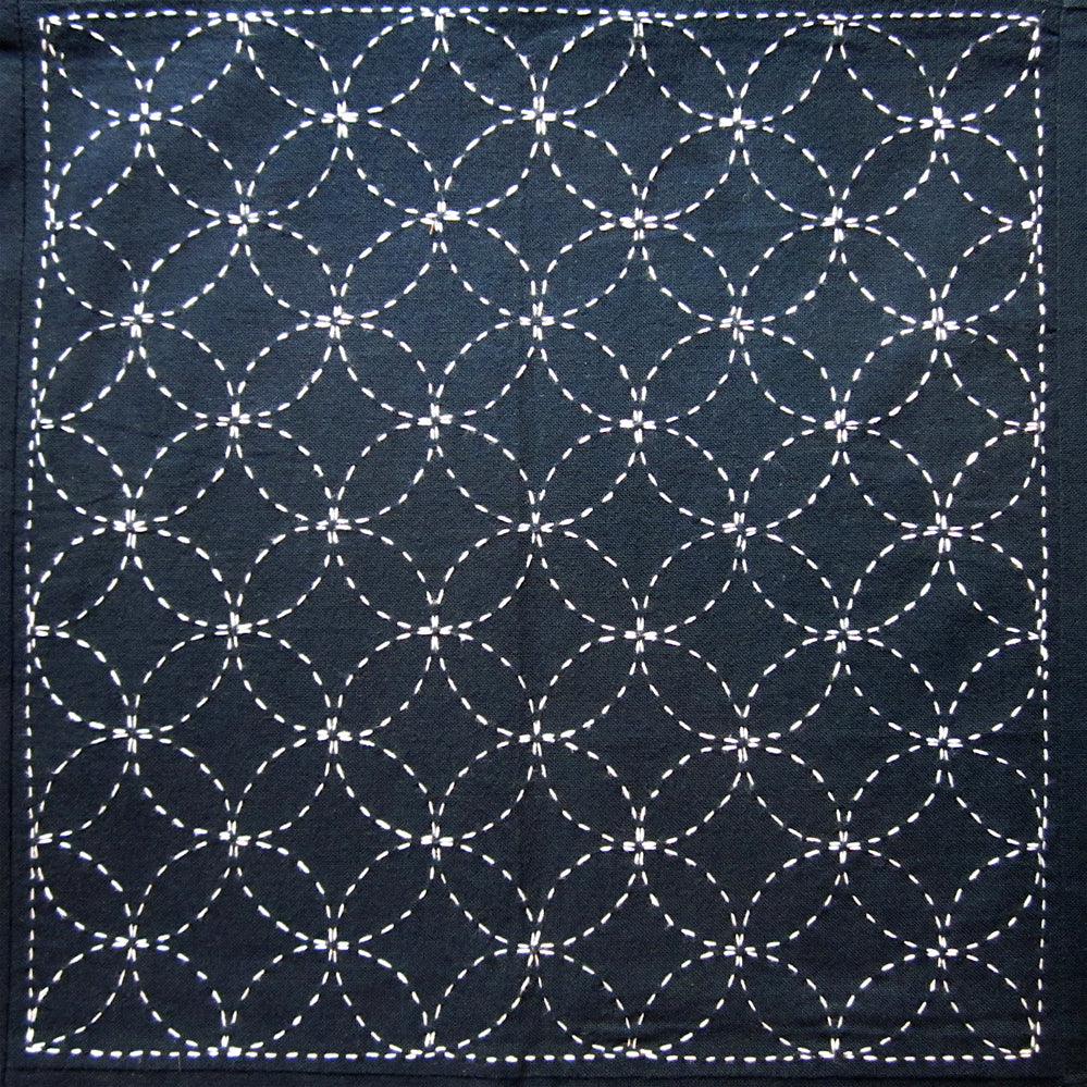 This very popular preprinted Japanese sashiko fabric features the traditional Linked Seven Treasures design. Stitch on stamped lines with sashiko thread, embroidery floss or pearl cotton. Pale blue stamped lines dissolve in water. Panels are 100% navy blue cotton and measure 14" x 28" each. Stamped design is 14" square, covering half of the panel, and a plain square, which can be used as the back of a pillow or bag, makes up the other half.