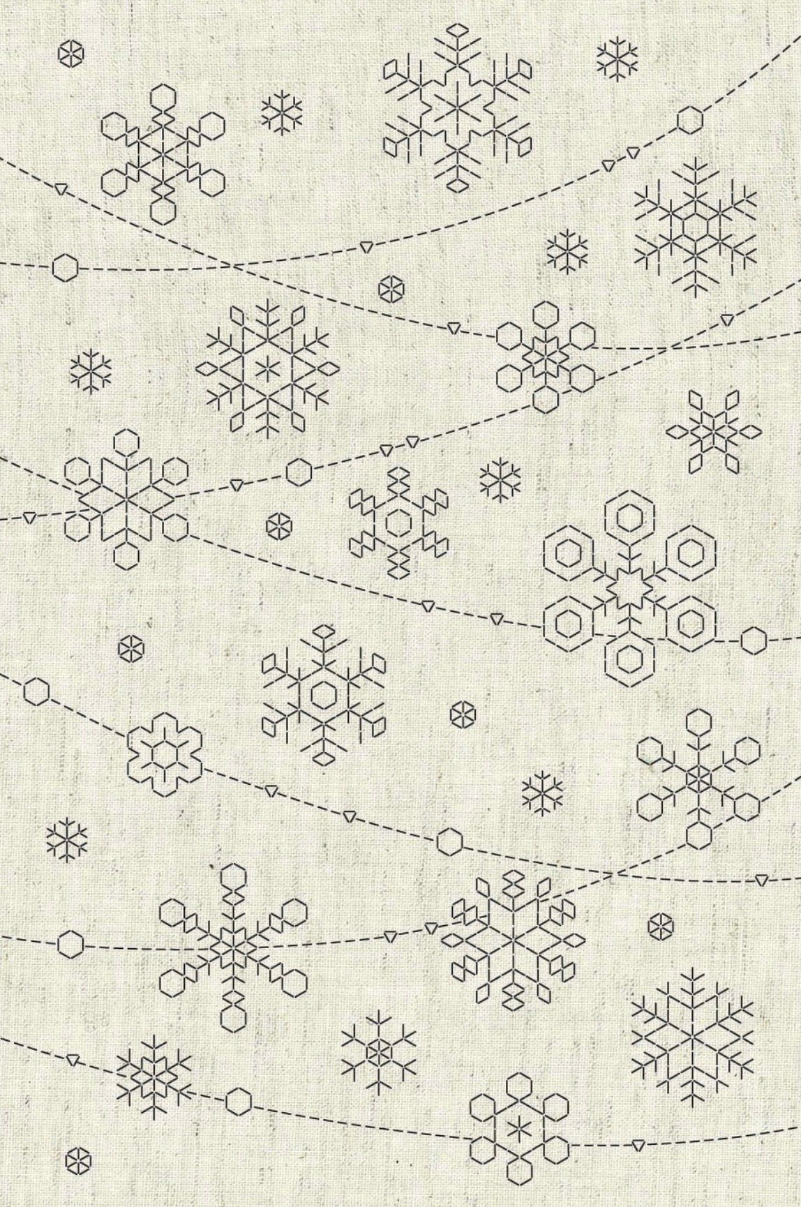 This preprinted Japanese Sashiko fabric features unique snowflakes in natural beige. This panel is 85% cotton and 15% linen and measures approximately 12" wide x 18" long. Stitch on stamped, water soluble lines with Sashiko thread. You may need up to 25 metres of thread.