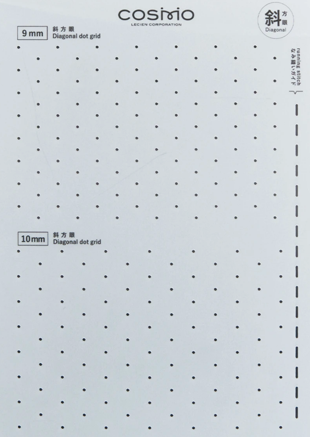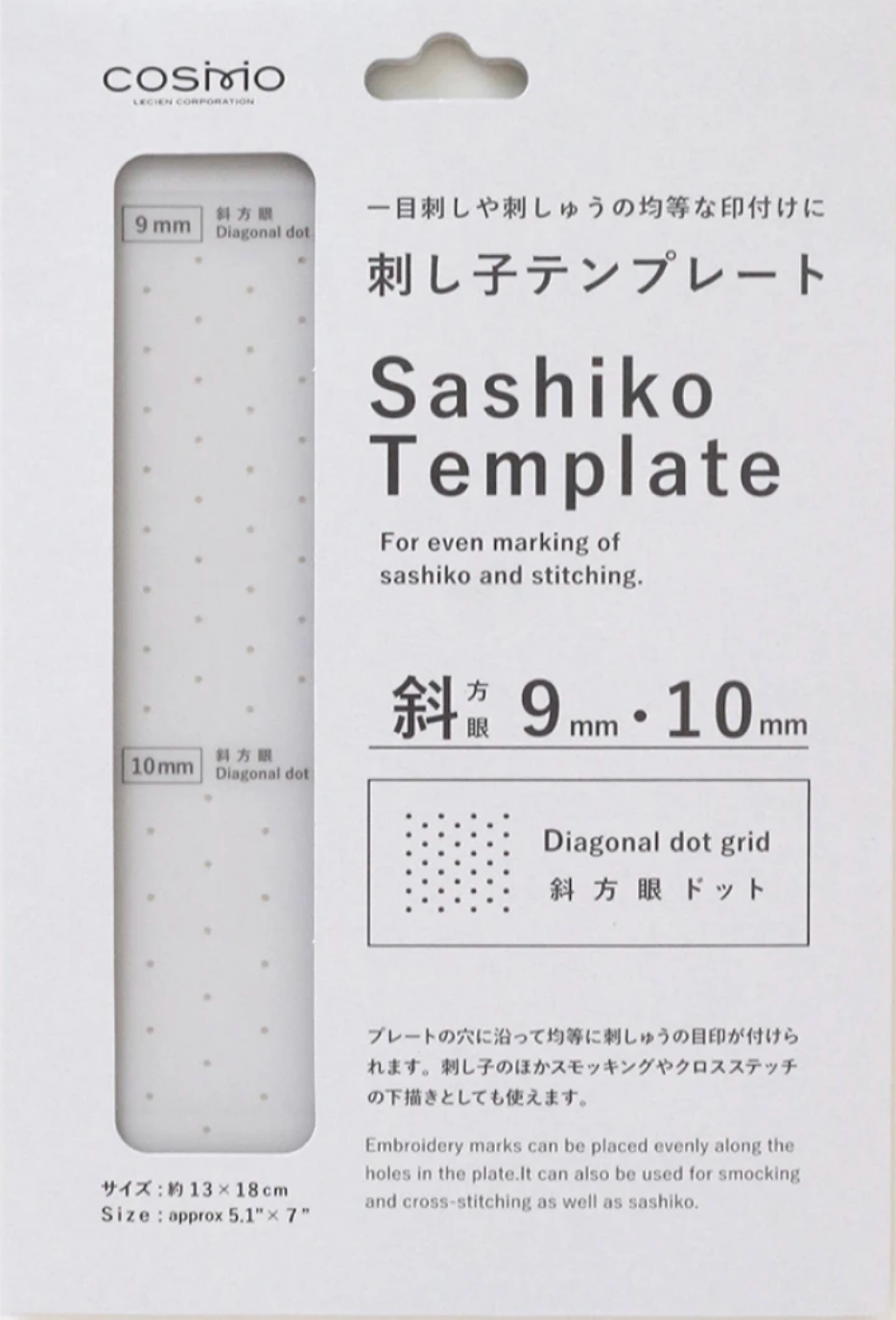 From Cosmo of Japan, this template allows for quick and easy way transfer of a dot grid to your fabric for Sashiko stitching.  Package includes both 9 mm. and 10 mm. diagonal grid.  Best used with chalk pouncer.