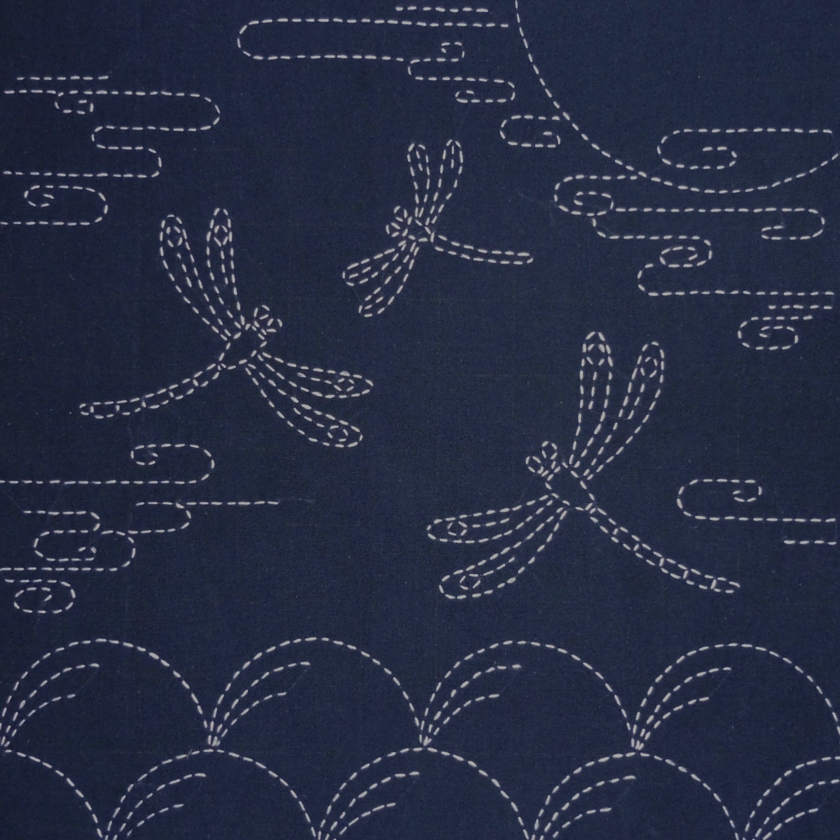 This preprinted Japanese sashiko fabric features dragonflies in autumn.  Stitch on stamped lines with sashiko thread, embroidery floss or pearl cotton. White stamped lines dissolve in water. Panels are 100% navy blue cotton and measure 14" x 28" each. Stamped design is 14" square, covering half of the panel, and a plain square, which can be used as the back of a pillow or bag, makes up the other half.