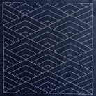 This preprinted Japanese sashiko fabric features a variation of the more common rounded ocean waves. Stitch on stamped lines with sashiko thread, embroidery floss or pearl cotton. Pale blue stamped lines dissolve in water. Panels are 100% navy blue cotton and measure 14" x 28" each. Stamped design is 14" square, covering half of the panel, and a plain square, which can be used as the back of a pillow or bag, makes up the other half.