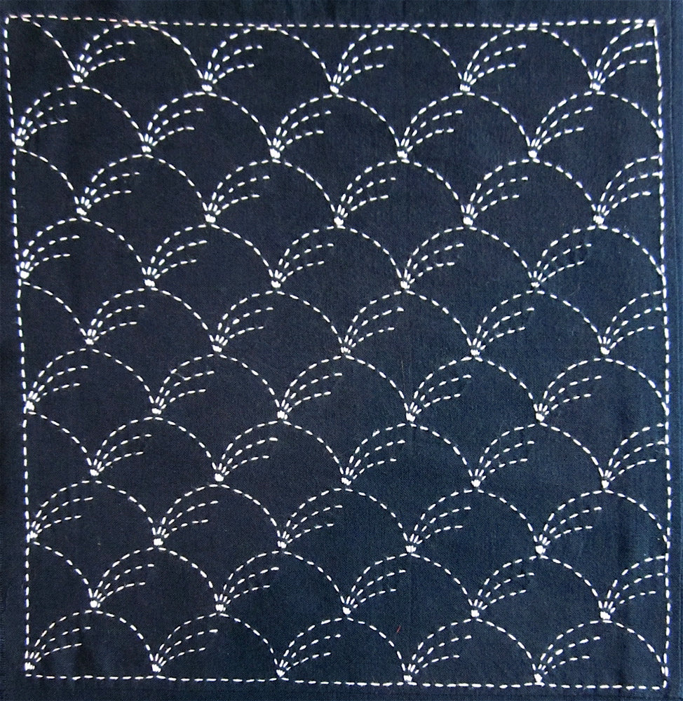 This preprinted Japanese sashiko fabric features wind blown grass. Stitch on stamped lines with sashiko thread, embroidery floss or pearl cotton. Pale blue stamped lines dissolve in water. Panels are 100% navy blue cotton and measure 14" x 28" each. Stamped design is 14" square, covering half of the panel, and a plain square, which can be used as the back of a pillow or bag, makes up the other half.