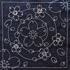 This preprinted Japanese sashiko fabric features the traditional cherry blossom design. Stitch on stamped lines with sashiko thread, embroidery floss or pearl cotton. Pale blue stamped lines dissolve in water. Panels are 100% navy blue cotton and measure 14" x 28" each. Stamped design is 14" square, covering half of the panel, and a plain square, which can be used as the back of a pillow or bag, makes up the other half.