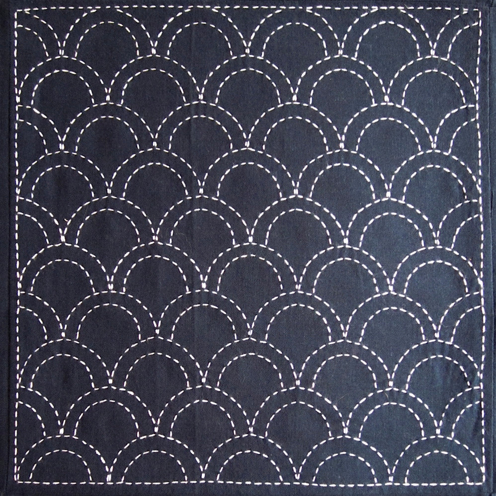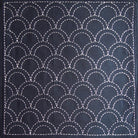 This very popular preprinted Japanese sashiko fabric features stylized ocean waves. Stitch on stamped lines with sashiko thread, embroidery floss or pearl cotton. Pale blue stamped lines dissolve in water. Panels are 100% navy blue cotton and measure 14" x 28" each. Stamped design is 14" square, covering half of the panel, and a plain square, which can be used as the back of a pillow or bag, makes up the other half.