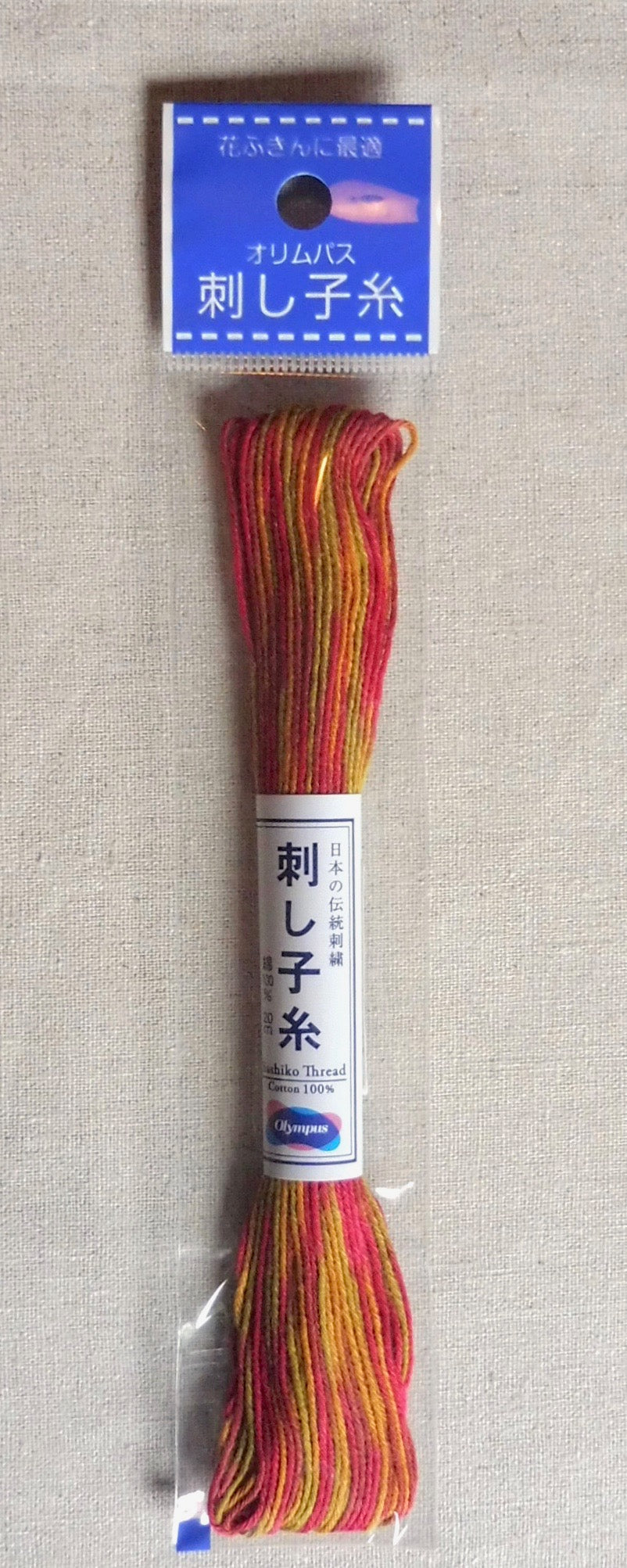 Imported from Olympus of Japan, this is a 20 metre skein of thick cotton thread in low contrast variegated red, orange and olive green.