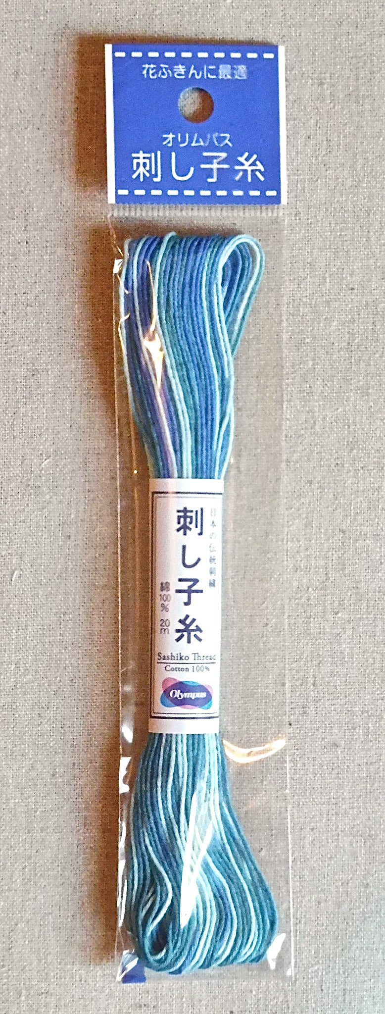 Imported from Olympus of Japan, this is a 20 metre skein of thick cotton thread in variegated aqua, sea foam green and sky blue.