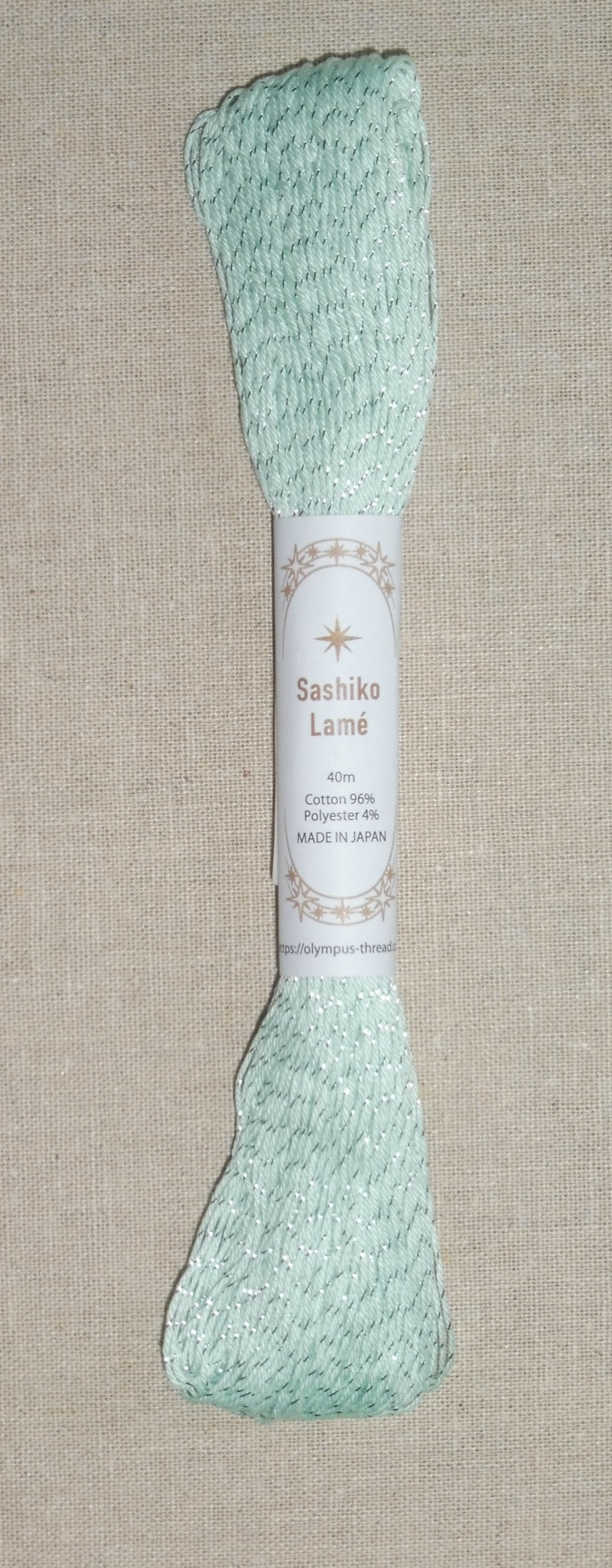 Imported from Olympus of Japan, this is a 40 metre skein of thin cotton thread wrapped in a single delicate strand of metallic silver.