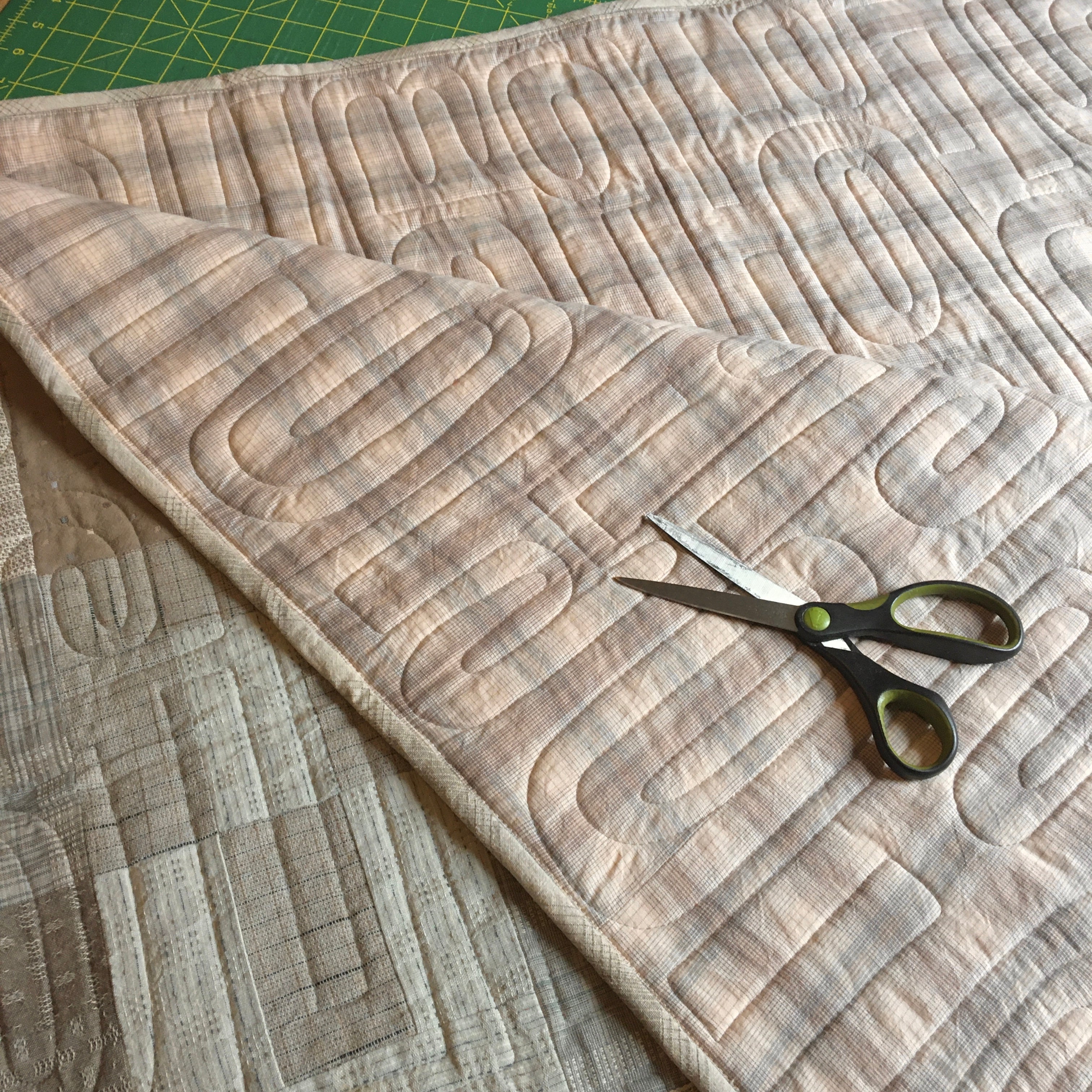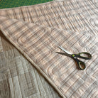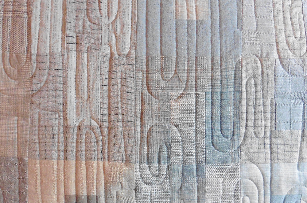 This quilt features gorgeous textured yarn dyed fabrics from Japan in a lovely medium range of beige and gray. This pattern called Gemini was designed by Janine Burke of Designs by jb - the pattern is available for purchase - and my retired store sample was sold with permission. This quilt measures 46" x 65" and is appropriate for a lap or throw quilt. The machine quilting in a coordinating thread can been seen in the close up photo.