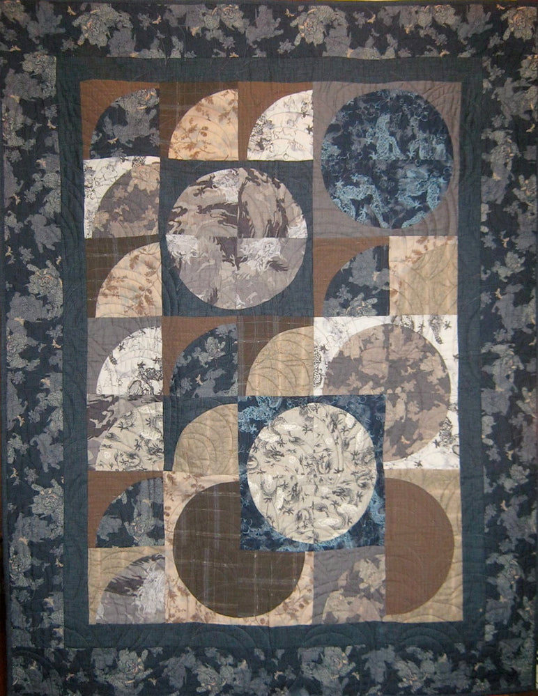 This quilt features gorgeous textured cotton fabrics imported from Japan. Colours are a calming blend of warm beige and grey with cadet blue and brown. The quilt pattern is a simple Drunkard's Path variation called Curves of Desire. This design was created by Fran O'Neill and my retired store sample was sold with permission. The quilt measures 45" x 57," which is appropriate for small lap quilt or wall hanging.