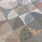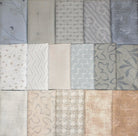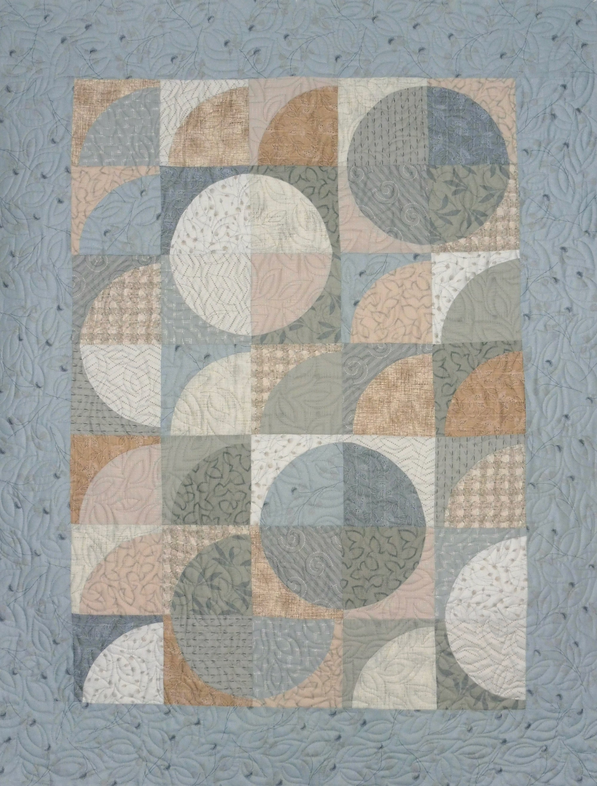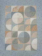 Kallisti's updated warmer version of Curves of Desire features a lovely soft palette of light to medium blue Japanese Blender prints with the addition of a few soft light browns. This pattern was designed by quilt teacher Fran O'Neill and can be purchased separately. It's a variation of the traditional Drunkard's Path block and finishes approximately 41" x 53," which is appropriate for a lap, small throw, baby quilt or wall hanging. My retired shop sample was sold with permission.