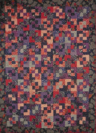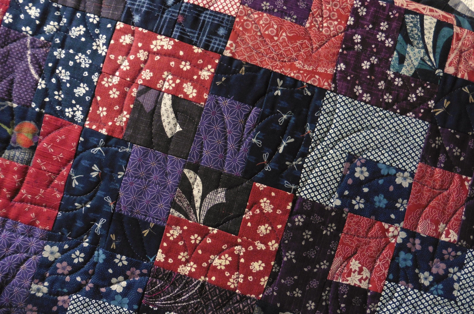This quilt features gorgeous textured quilting and dobby prints imported from Japan. All fabrics are 100% superior quality cotton. Print motifs include traditional patterns, including ribbons, cherry blossoms and dragonfly designs. Main colors are dark shades of navy, purple and red. The quilt pattern is a variation on Log Cabin called Eclipse and was created by designer Janine Burke of Designs by jb - the pattern is available for purchase - and my retired shop sample was sold with permission. Details of the professional machine quilting in an echoing leaf design can be seen in the closeup photo. The quilt measures approximately 64" x 86," which is appropriate for a large throw.