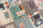 This quilt features approximately 16 different fabrics imported from Japan. Fabrics include quilting weight and textured dobby prints with traditional motifs, such as the chrysanthemum, cherry blossom, hemp leaf and dragonflies. Colours are shades of aqua and grey with cream and pink accents. The pattern called Gems was designed by Janine Burke of Designs by jb - the pattern is available for purchase - and my retired store sample was sold with permission. This quilt measures 59" x 89" and is appropriate for a large throw, short twin bed or twin bed with foot board.
