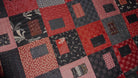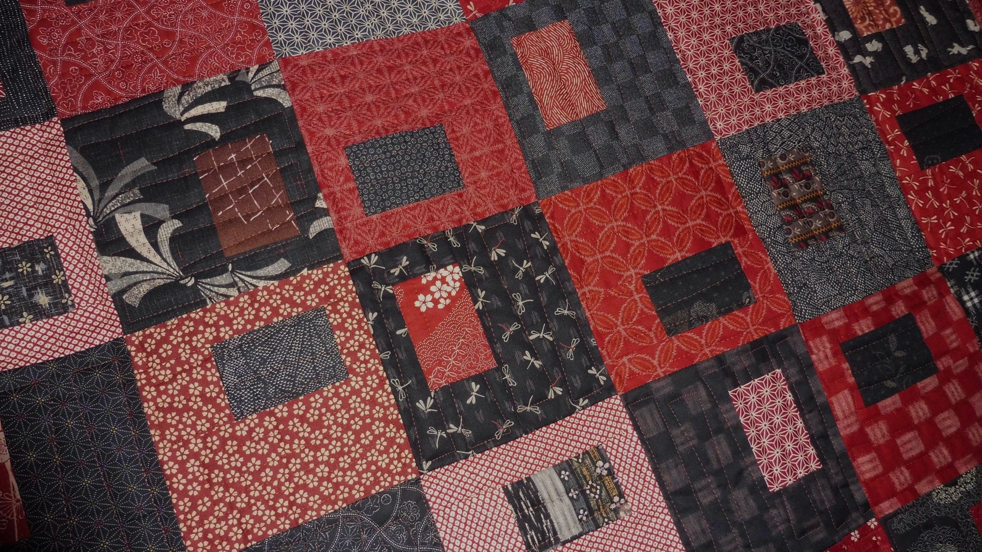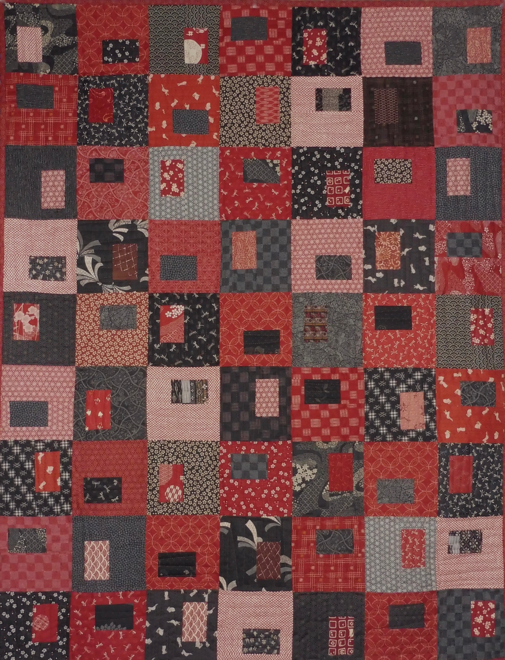 This quilt showcases many different fabrics imported from Japan. Fabrics feature traditional motifs, such as the cherry blossom, hemp leaf, ocean waves, dragonflies and rabbits. Colours are shades of black and red with beige and cream accents. The pattern is called Gems and was designed by Janine Burke. My retired store sample is being sold with permission. This quilt measures 41" x 54" and is appropriate for a lap quilt or small throw. You can also use it as a wall hanging, if you request that a hidden sleeve be added to the back - no additional charge.