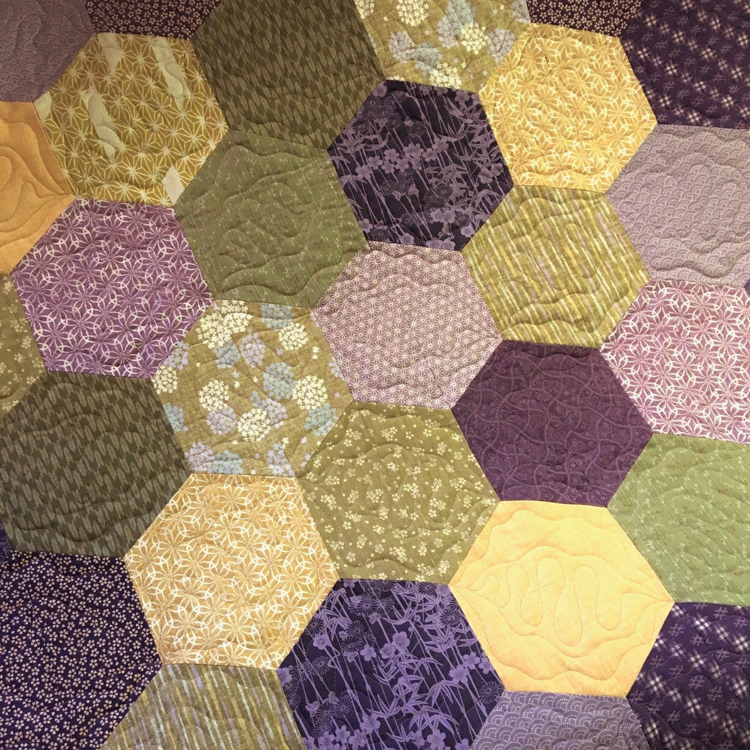 The simply constructed oversized hexagon block can play with shading and showcase large scale theme prints, as in Kallisti's newest Japanese version using traditional Japanese prints in purple, lilac, green and yellow. It finishes approximately 51" x 64," which is appropriate for a large throw. This pattern was designed by award winning quilt artist and teacher Johanna Masko and my retired store sample was sold with permission.