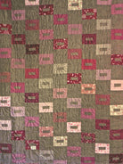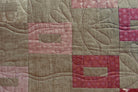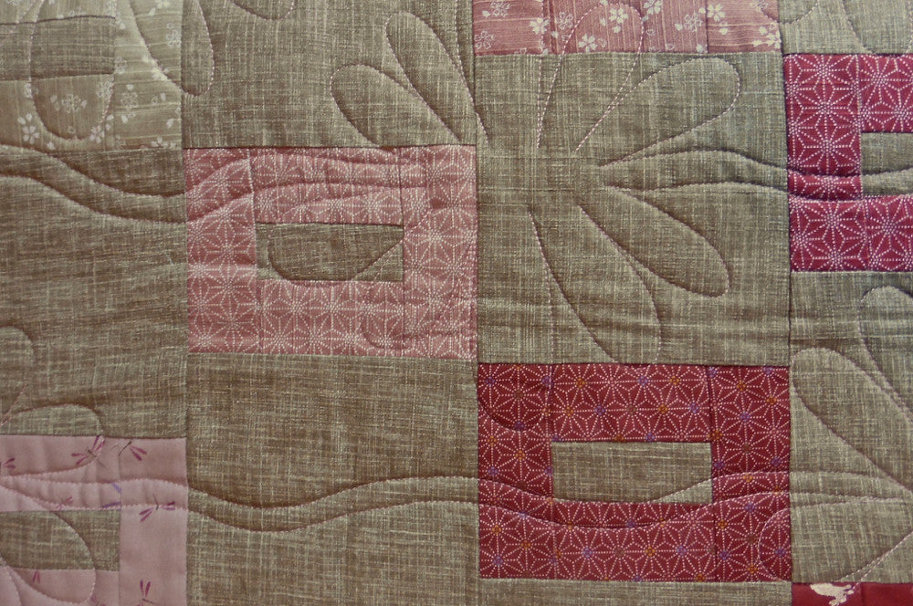 This quilt pattern called Lincoln's Platform was designed by Blue Underground Studios and my retired store sample was sold with permission. This quilt features many Japanese quilting prints and textured dobby prints in shades of red and pink. Print motifs include traditional Japanese designs, including dragonflies, bunnies and cherry blossoms. Details of the professional machine quilting in a wavy flower pattern can be seen in the closeup photo. The quilt measures 63" x 86" and is appropriate for a large throw, short twin quilt or twin bed with a foot board.