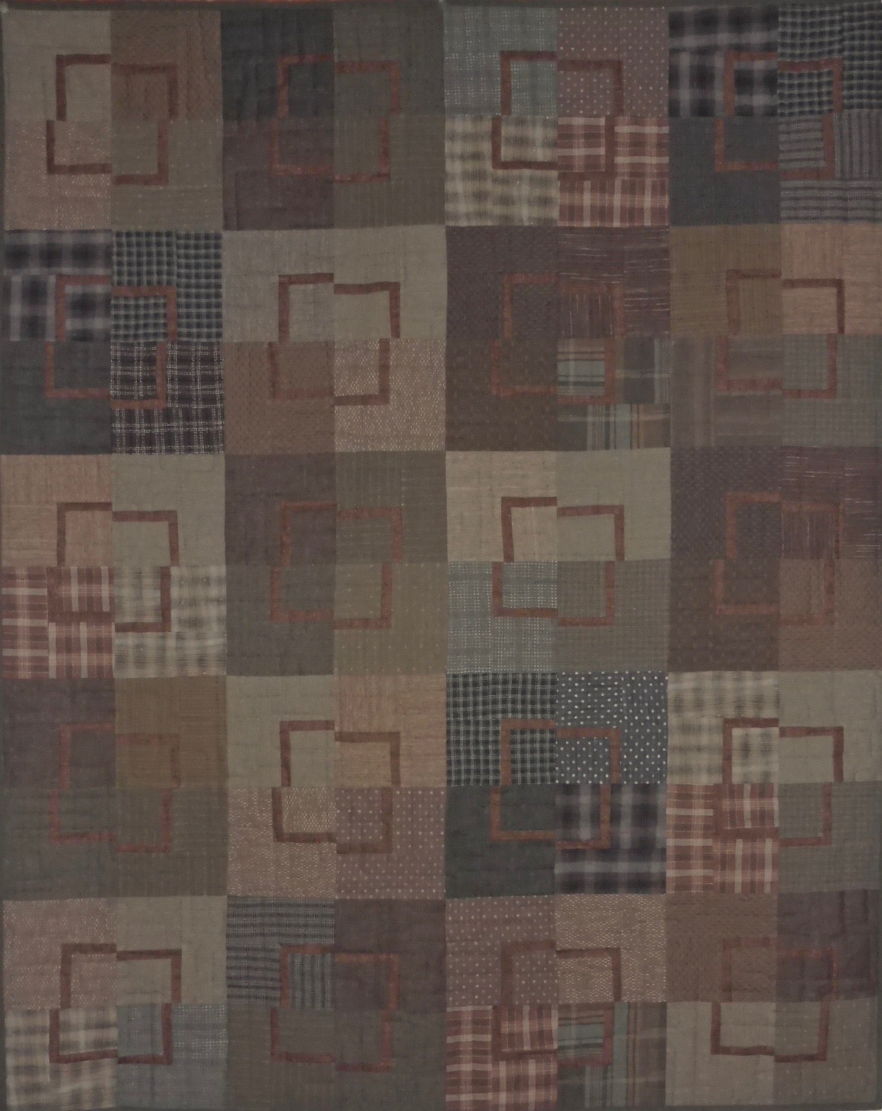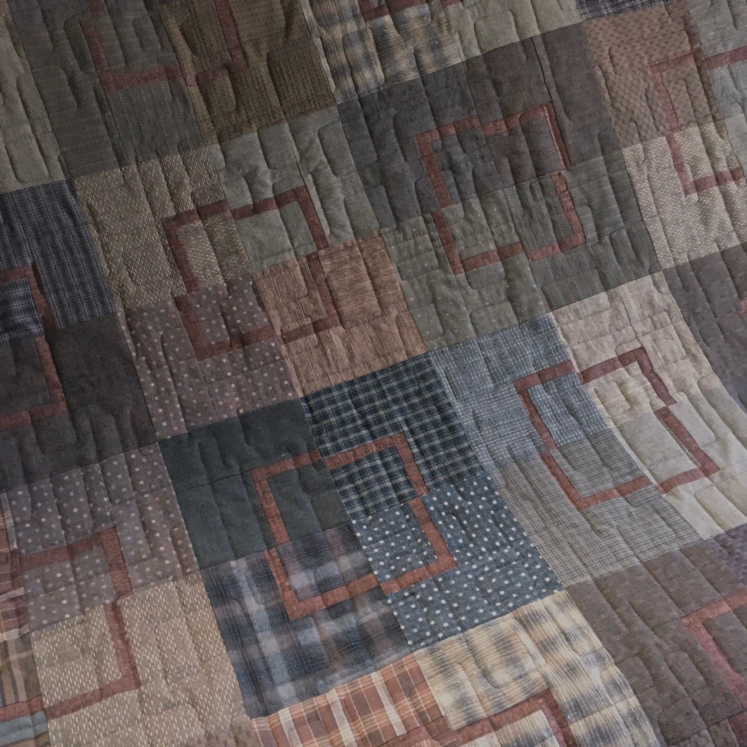 This pattern was designed by Janine Burke of Designs by JB and my retired shop sample was sold with permission.  It features fractured concentric square blocks that play with movement and accommodates a variety of scale.  Kallisti's scrappy version of this pattern features gorgeous Japanese yarn dyed fabrics in brown, grey and black with a rust accent.  It measures approximately 47" x 59," which is appropriate for a throw quilt.
