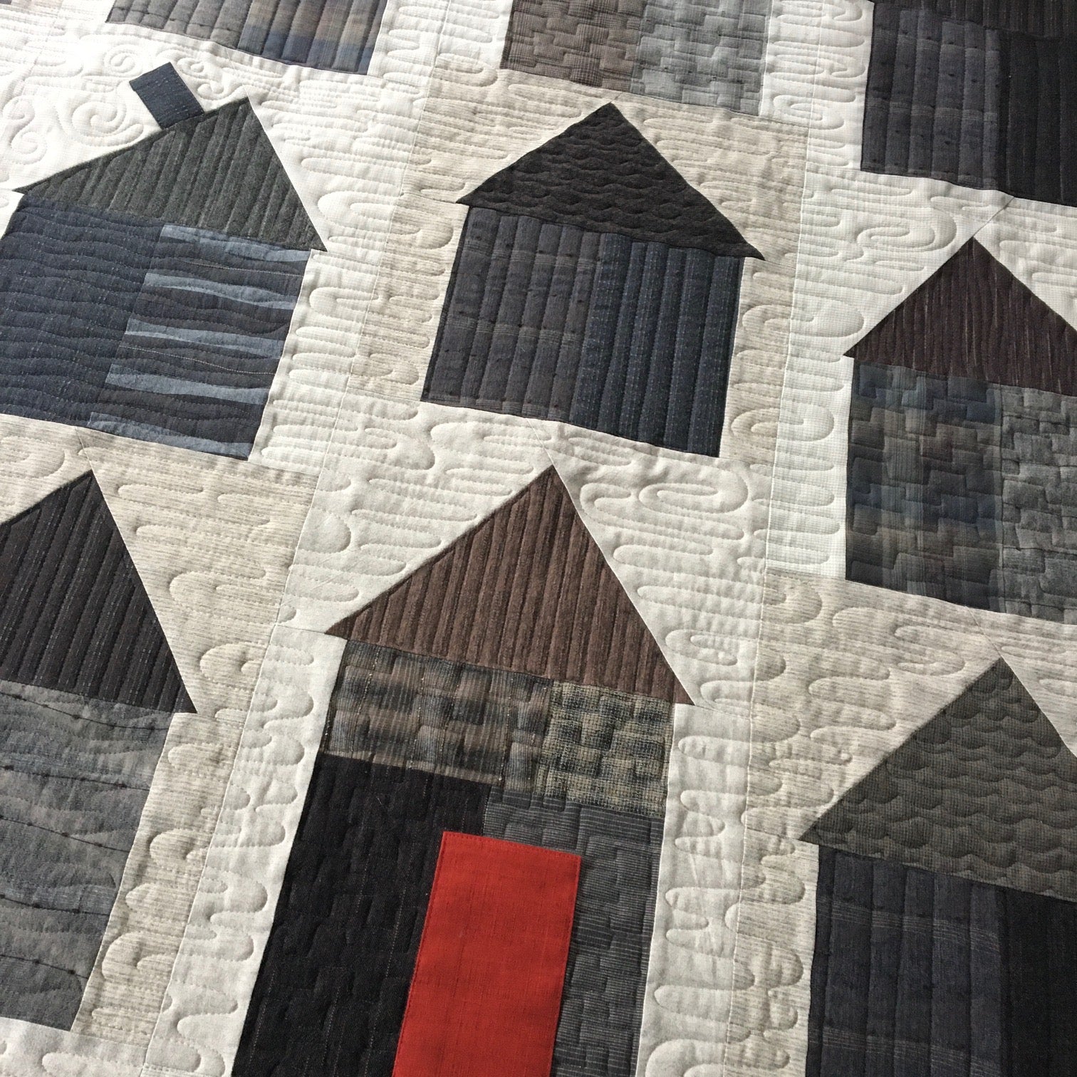 This quilt has been reduced to 50% of its original price. It features bold plaid and specialty Japanese yarn dyes in dark neutrals with a variety of light yarn dyed backgrounds. The pattern called The Red Door was designed by Bella Nonna and my retired store sample is being sold with permission. The quilt measures approximately 47" x 69," which is appropriate for a lap, small throw or wall hanging.