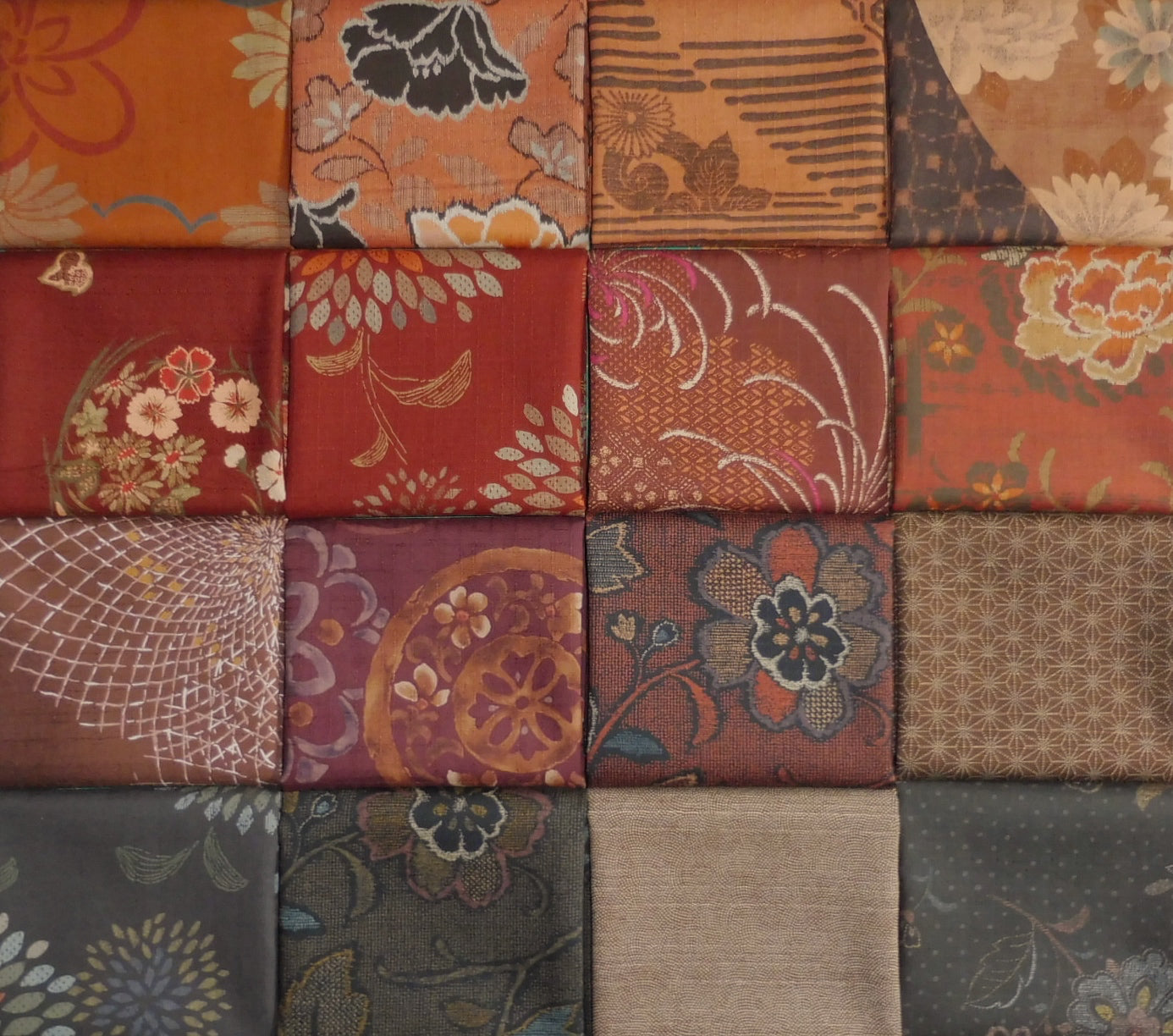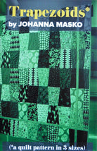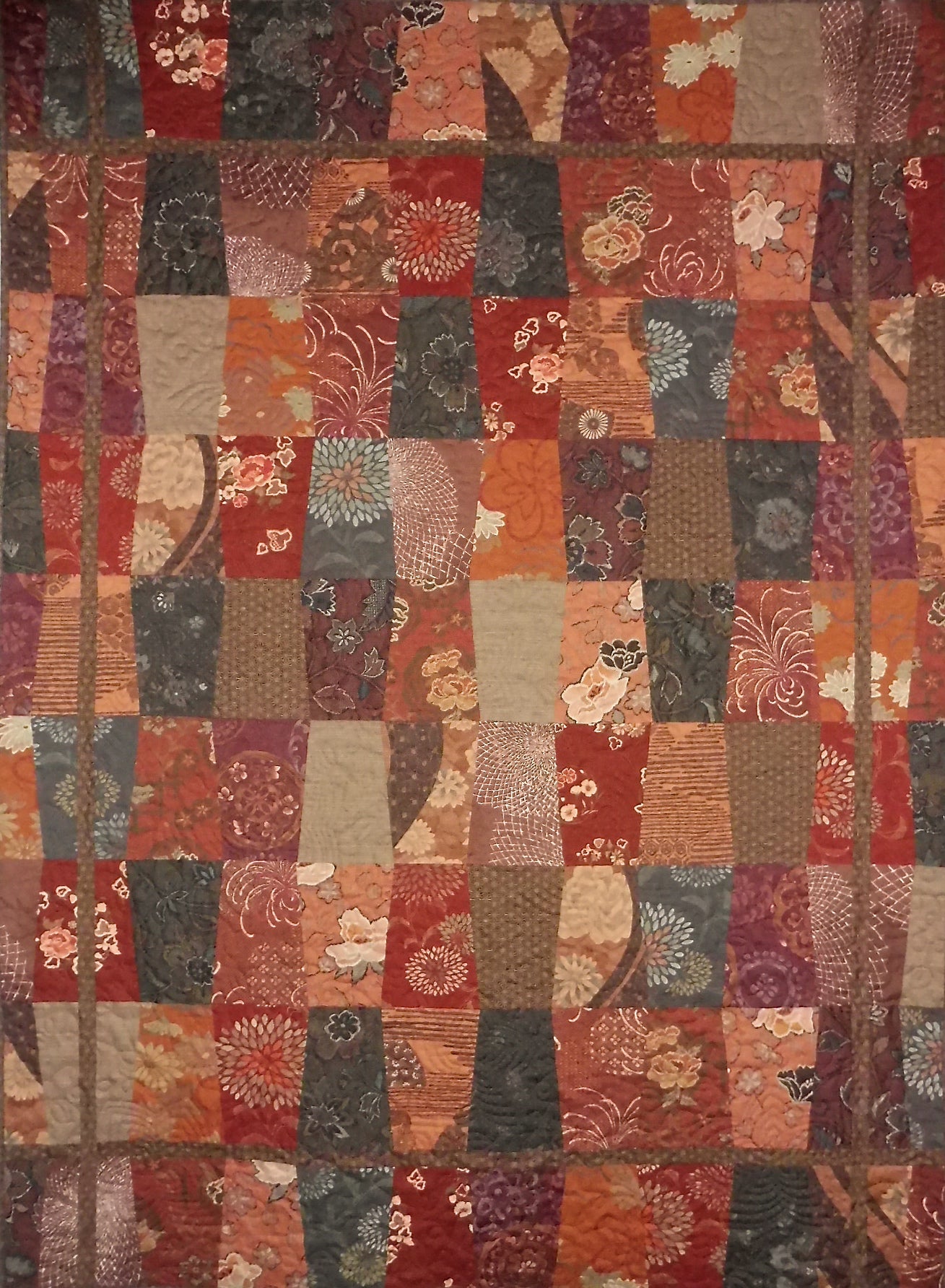 Kallisti's autumn version of this pattern features gorgeous textured Japanese froral prints in brown, rust, dark orange and burgundy.  It measures approximately 56" x 76," which is appropriate for a throw quilt.  This pattern was designed by award-winning quilt maker and teacher Johanna Masko and my retired store sample was sold with permission.
