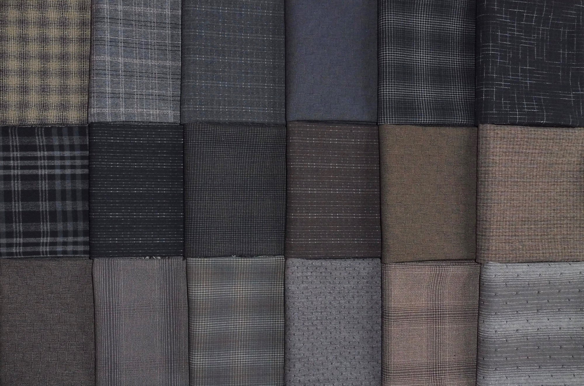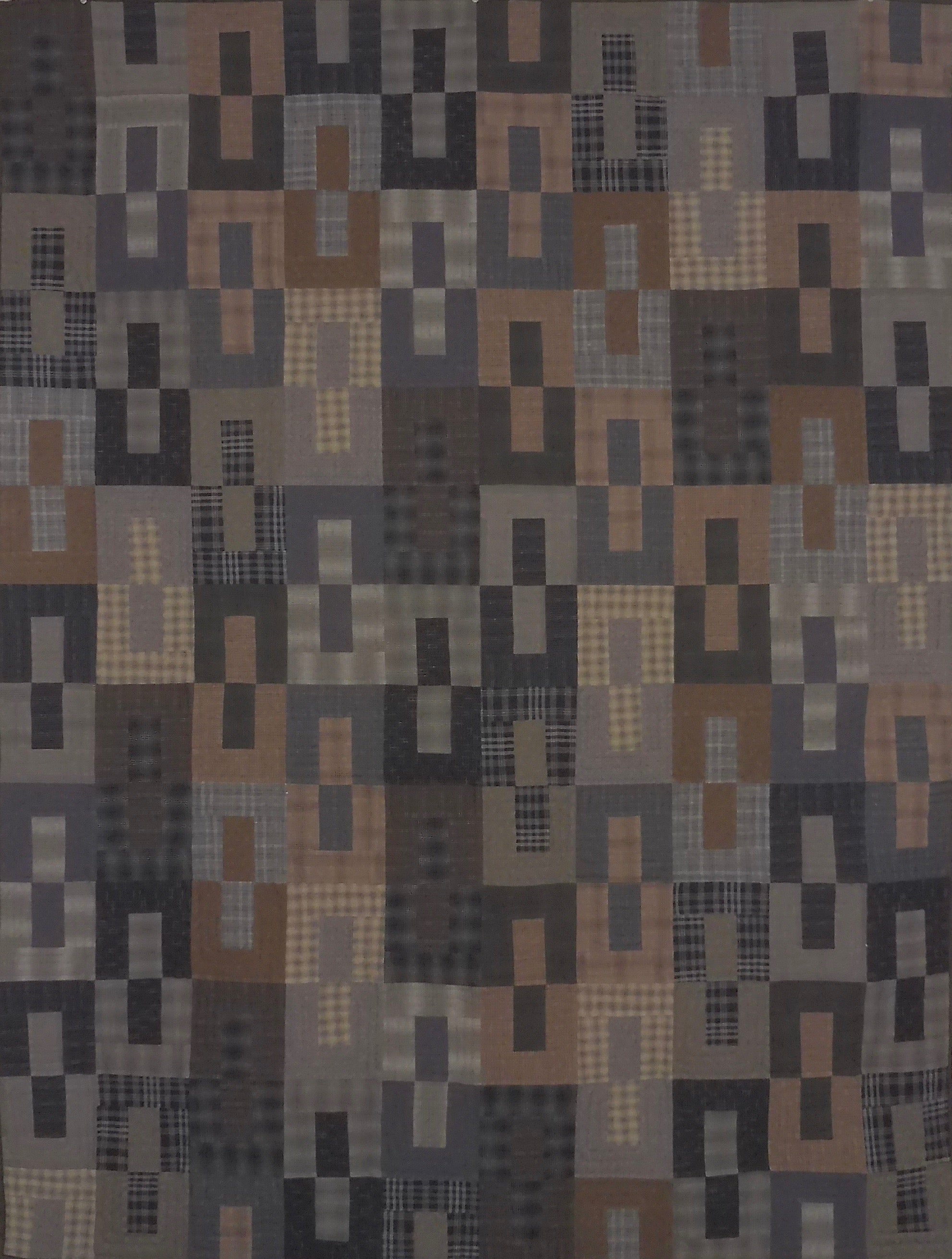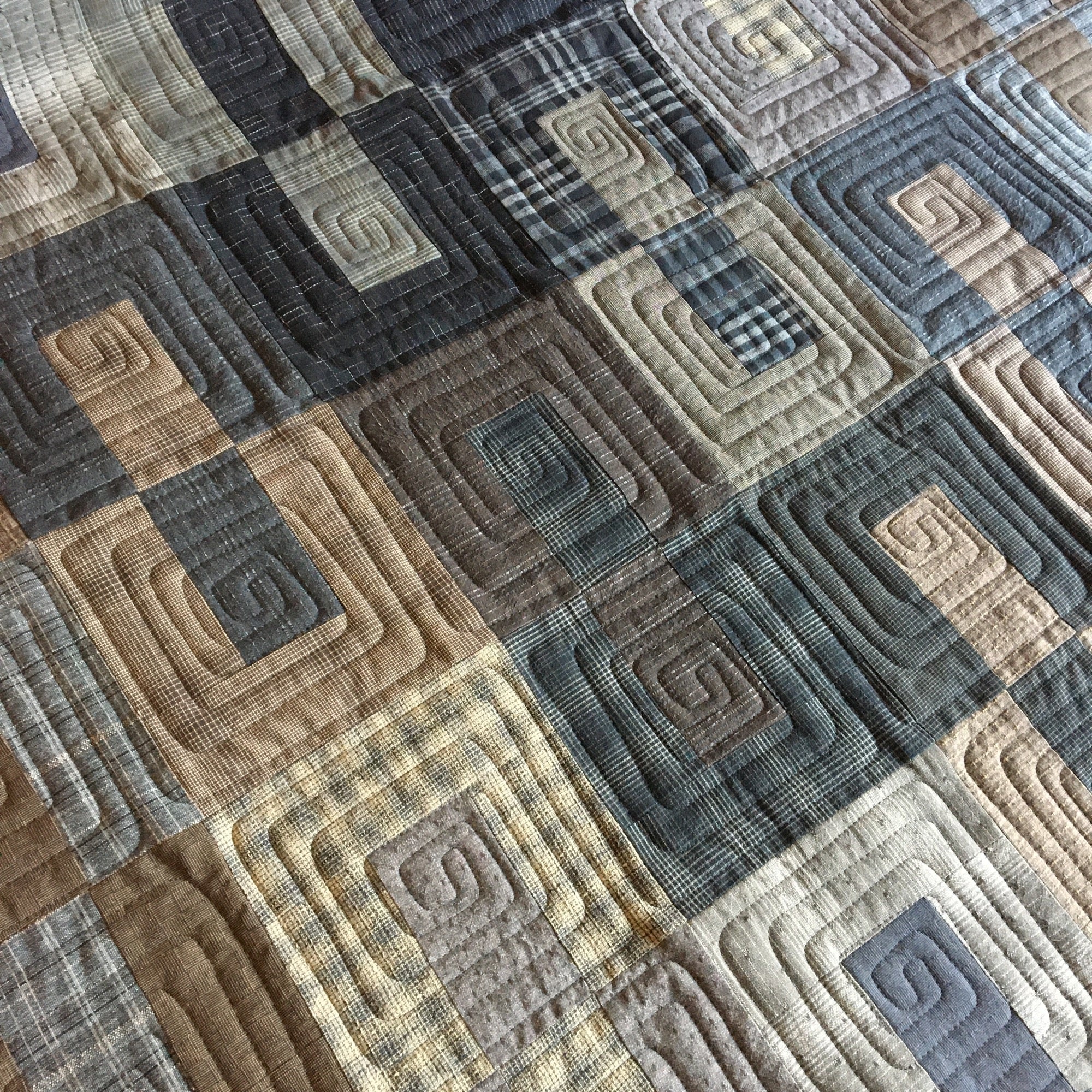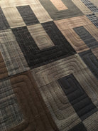 The popular quilt pattern features long, staggered blocks with alternating fabric placement to represent twins. It was created by designer Janine Burke of Designs by jb and my retired store sample was sold with permission. This version features a warm and cosy palette of brown, grey and black fabrics from the Japanese Yarn Dye collection. The size is approximately 58" x 77," which is appropriate for a throw.
