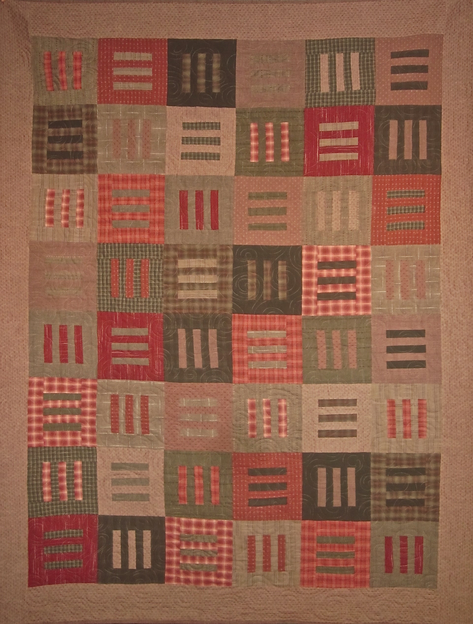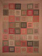 This quilt features gorgeous textured yarn dyed fabrics from Japan in a range of warm chocolate brown and raspberry red. The pattern called Modern Thinking was designed by Janine Burke of Designs by jb and my retired store sample was sold with permission. This quilt measures approximately 64" x 80," which is appropriate for a large throw.