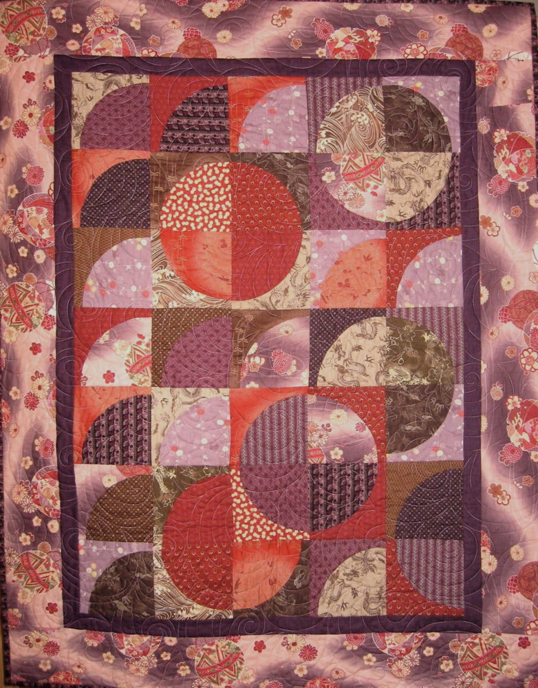 This quilt features gorgeous textured cotton fabrics imported from Japan. Colours are a warm blend of red, purple and brown.  The quilt pattern is a simple Drunkard's Path variation called Curves of Desire. This design was created by Fran O'Neill and my retired store sample was sold with permission. The quilt measures approximately 45" x 57," which is appropriate for small lap quilt or wall hanging.