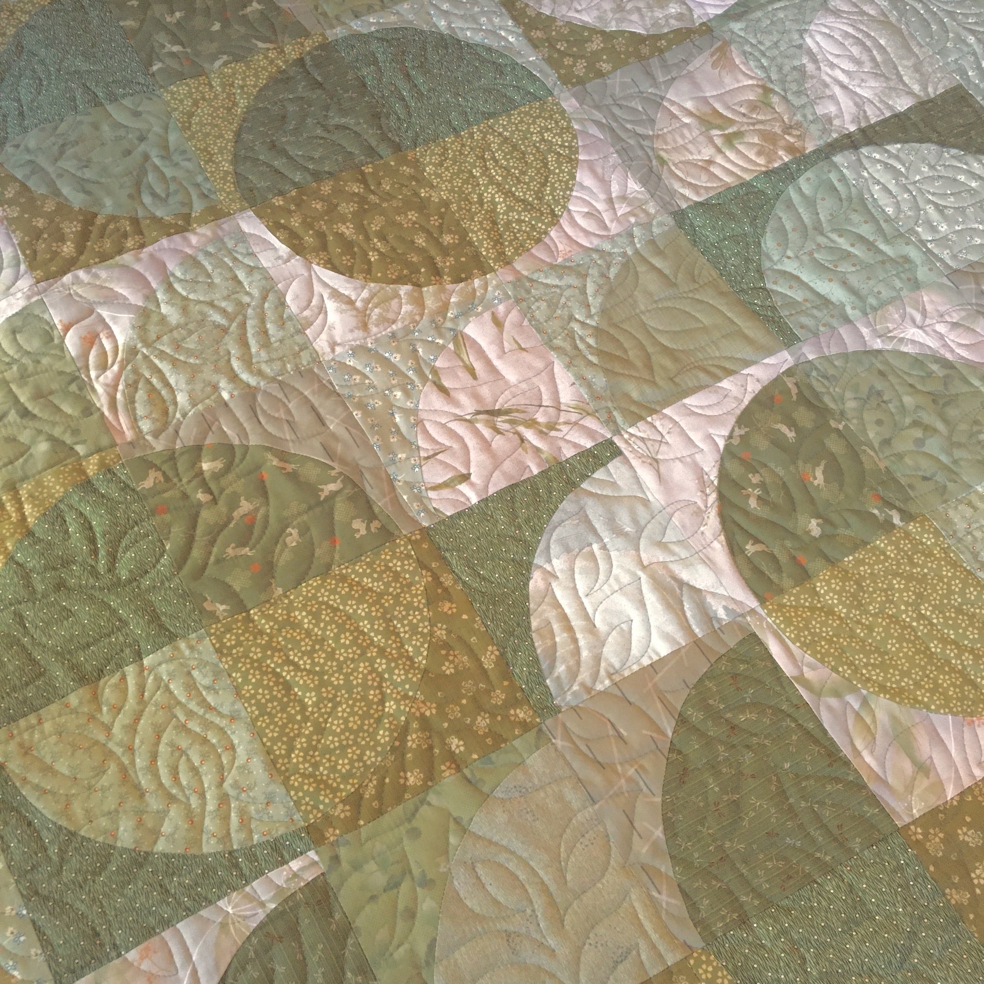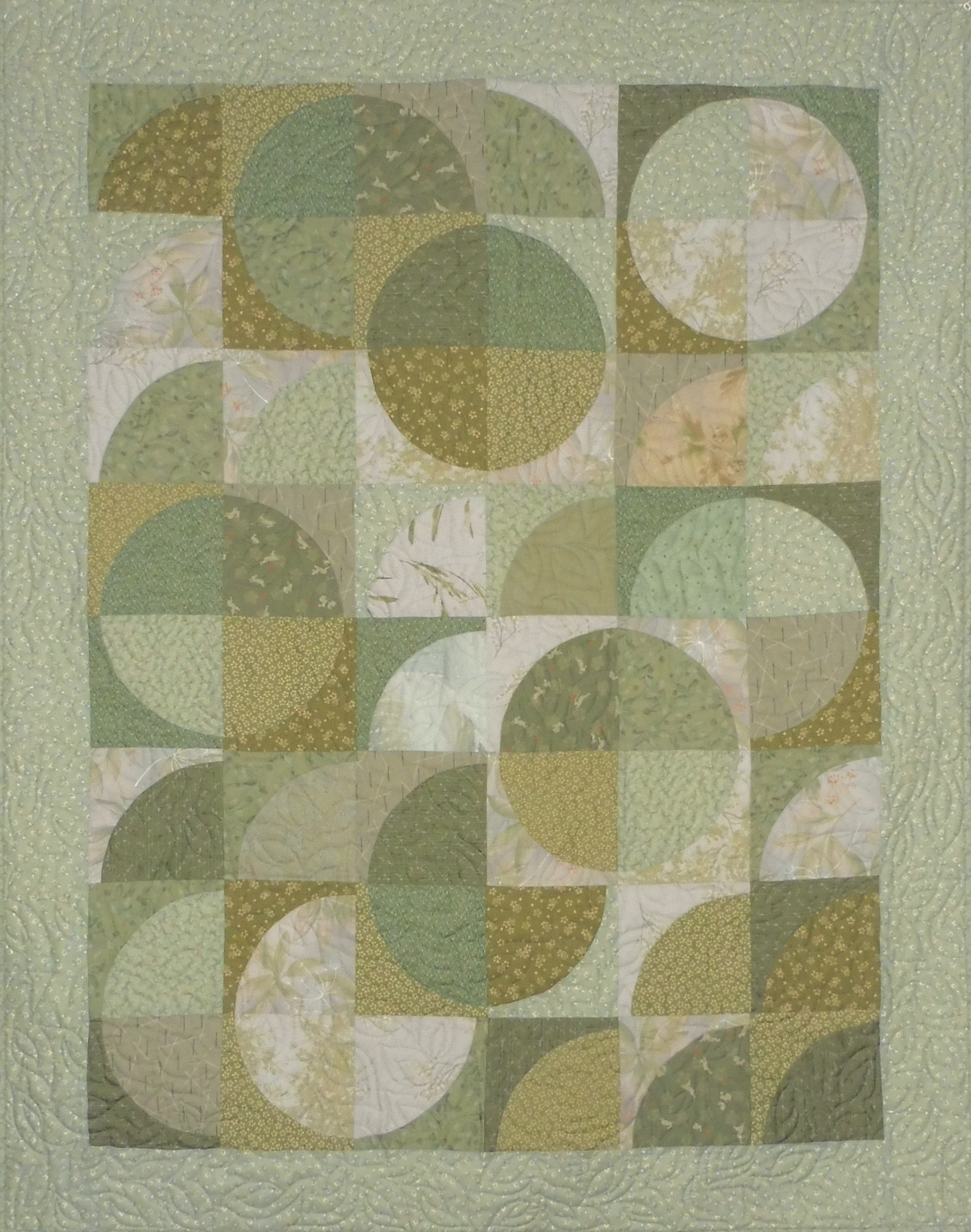 Kallisti's recent version of Curves of Desire features a soft palette of green Japanese prints in a range of tones.   This pattern was designed by quilt teacher Fran O'Neill and my retired store sample is being sold with permission.  It's a variation of the traditional Drunkard's Path block.  It finishes approximately 43" x 55," which is appropriate for a lap, small throw or baby quilt.