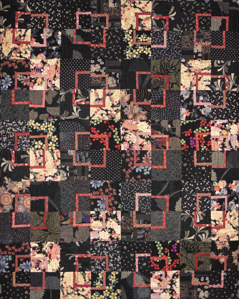 This quilt features more than a dozen beautiful cotton prints imported from Japan, including textured dobby cloth. Prints feature traditional motifs, such as dragonflies, cherry blossoms and chrysanthemum in rich reds and black with gold, beige and cream accents. This pattern is called Mod Quads and was designed by Janine Burke of Designs by jb.  My store sample is being sold with permission. The machine quilting in a geometric free motion design in a coordinating thread can be seen in the close up photo. The quilt measures 47" x 59," which is appropriate for large wall hanging or small throw. There is a flat sleeve across the back of the quilt for easy hanging.